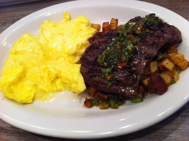 I went with the steak and eggs, served with chimichurri sauce and diced potatoes. It was hearty. And tasty.