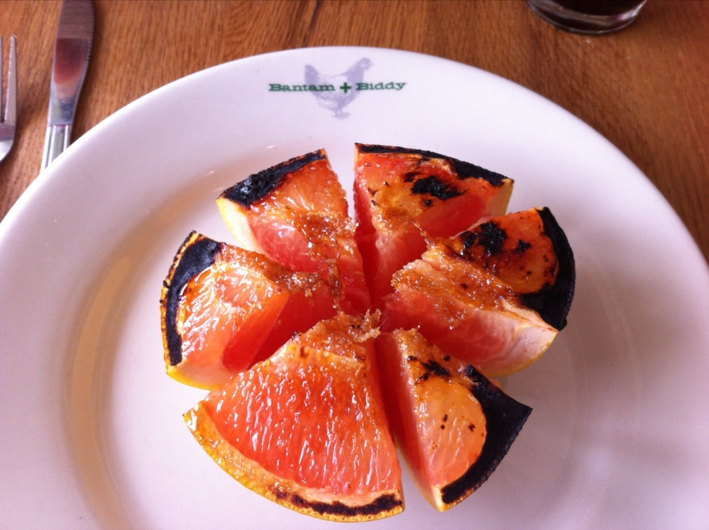 She started with the broiled grape fruit, tempted by the idea. We asked our waiter (who strongly resembled Levar Burton or, as he is also known, “that Reading Rainbow guy”) if it was thrown on the grill. He said that they placed it in the Salamander – typically a broiler with overhead infrared heating elements (I learned about these on the new show Burger Land, last weekend).