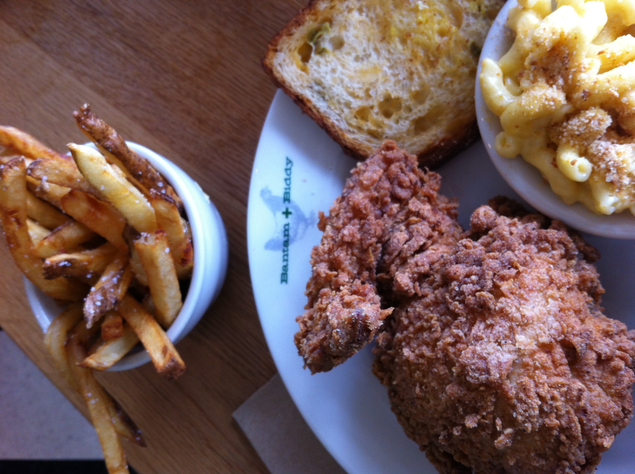 I chose the aged cheddar mac-N-cheese and the goat fat French fries, served with the same jalapeno cheddar toast. The chicken was fried with a thick crispy skin and the leg was the whitest dark meat chicken I’ve ever had. The chicken breast was moist and tender.