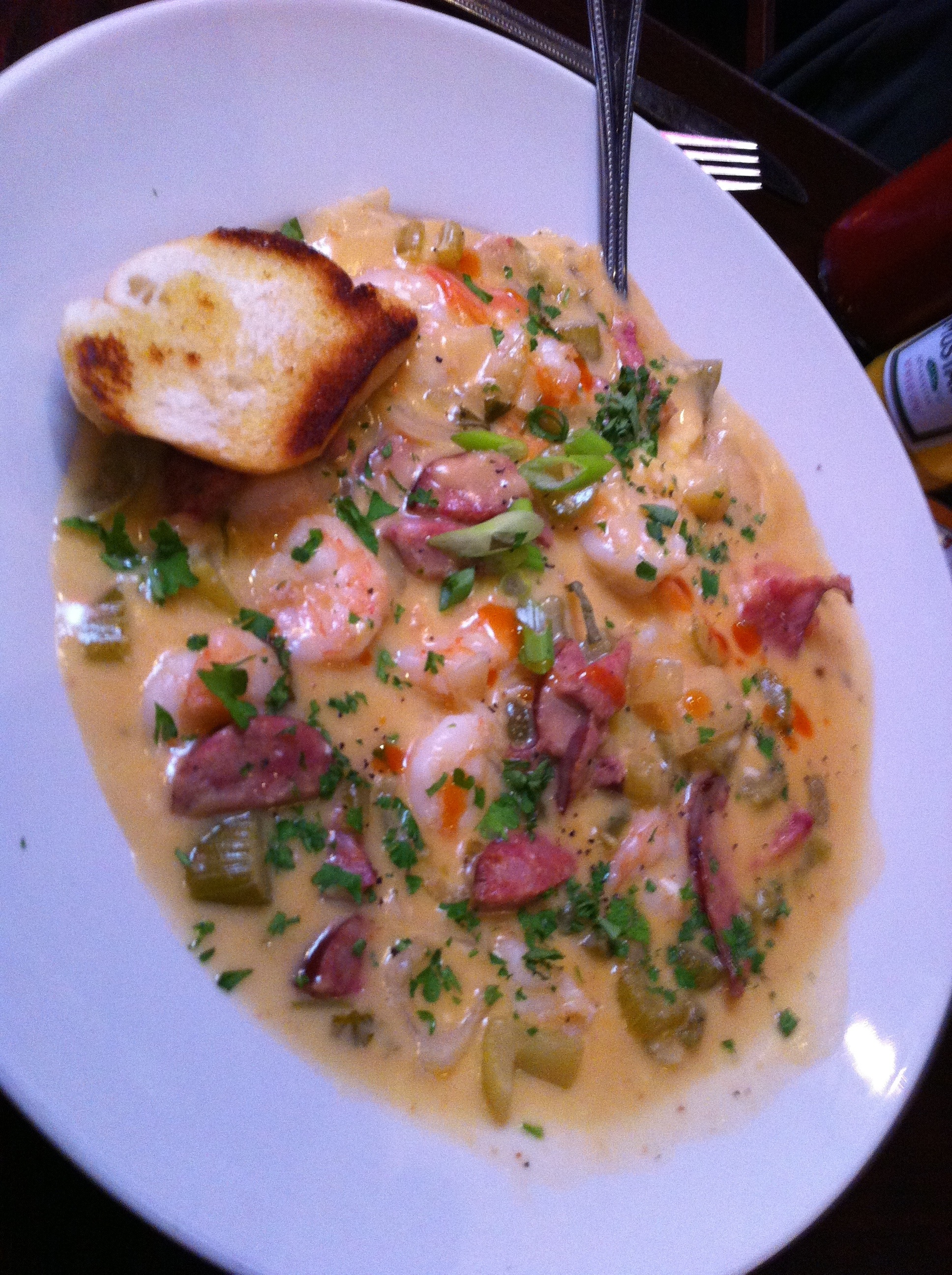 Their stated goal is to bring a taste of New Orleans to Atlanta, so I went with the shrimp and grits (the menu description: “Cobblestone Mill stone ground yellow grits, topped with plump shrimp in Toulouse sauce with tomato, andouille, and more than a hint of Sherry”)