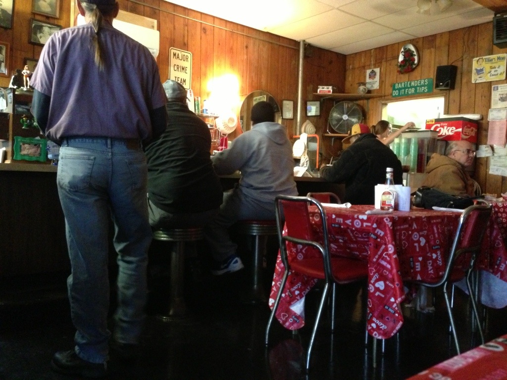 As we sat by the door, we watched everyone come in, particularly intrigued by an older couple who walked in midway through our meal. He sat at a table. She walked into the kitchen. We’d already seen several folks fixing their own drinks, so we gathered that they were all regulars. But she seemed awfully comfortable. A few minutes later, the lady from the kitchen was standing behind the counter telling someone, “My mother owns it. My sister runs it. I work for Hamilton County – I just came in for lunch.” But she’d been called into duty.