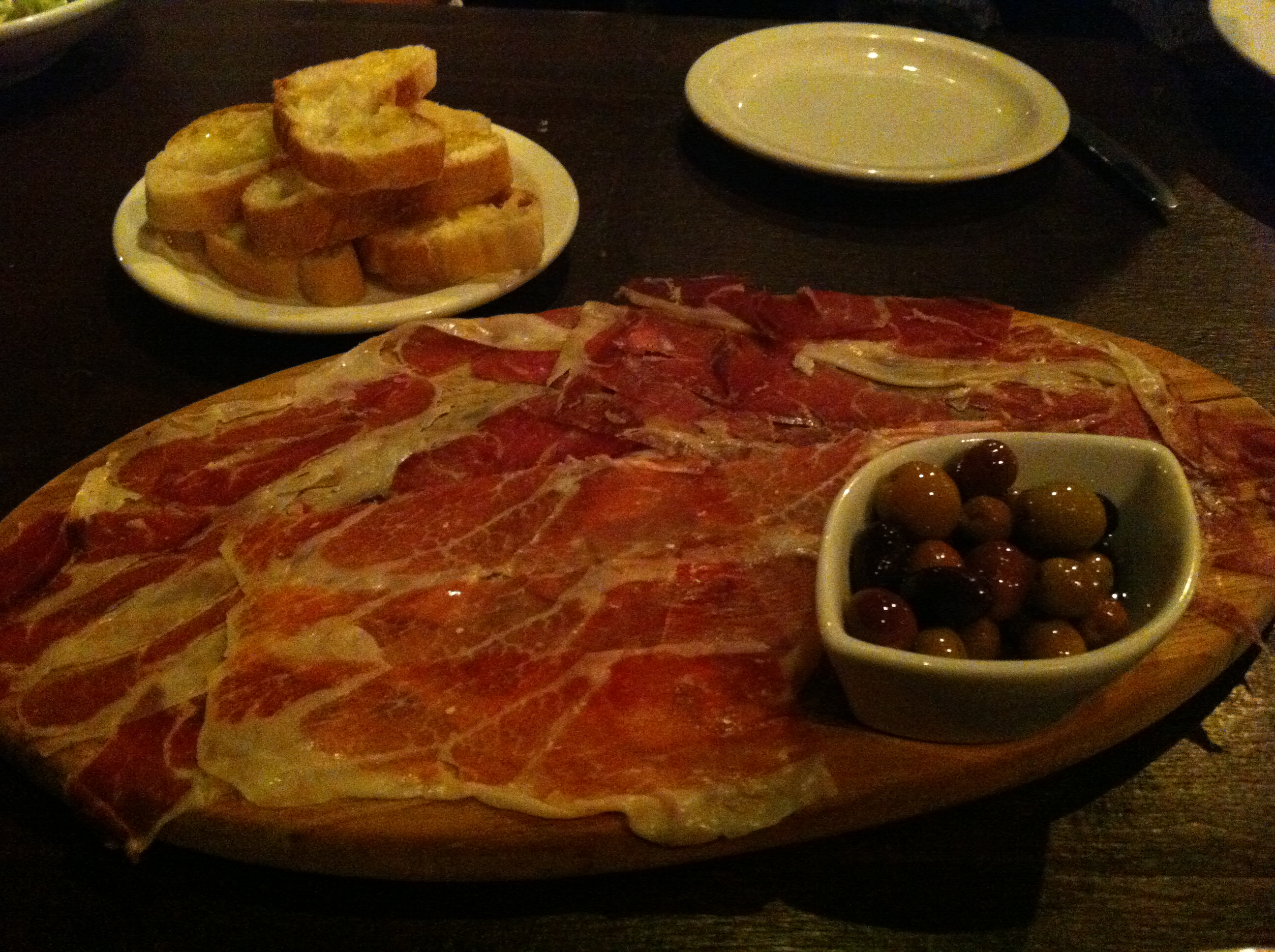 served with bread and olives. The Paleto and Loma were both very nutty. The Jamon was the tastiest of the bunch. But none of them tasted significantly superior to most prosciutto. There were also a couple of (non-pictured) salads at the table around this time.