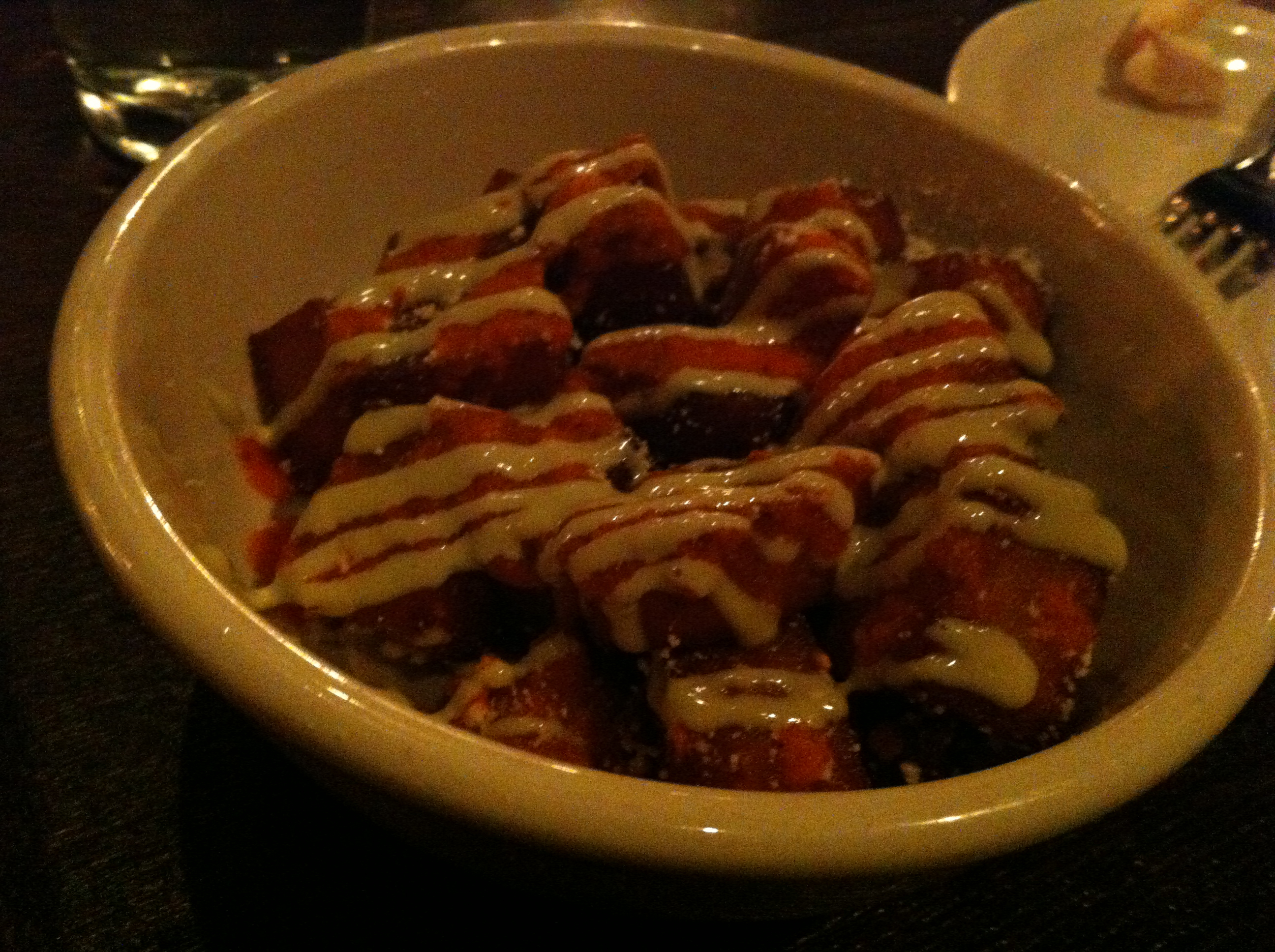 Of the four, the tacos and the mac-n-cheese were the best – by far. The tacos were near perfect, in both size and flavor. The mac-n-cheese was excellent, with just enough pork to flavor it without over-powering the cheese. I didn’t enjoy the ravioli in the least – a flavor in the filling (I’m guessing the truffles) that helped me decide not to finish those. The potatoes were good, but nothing spectacular.