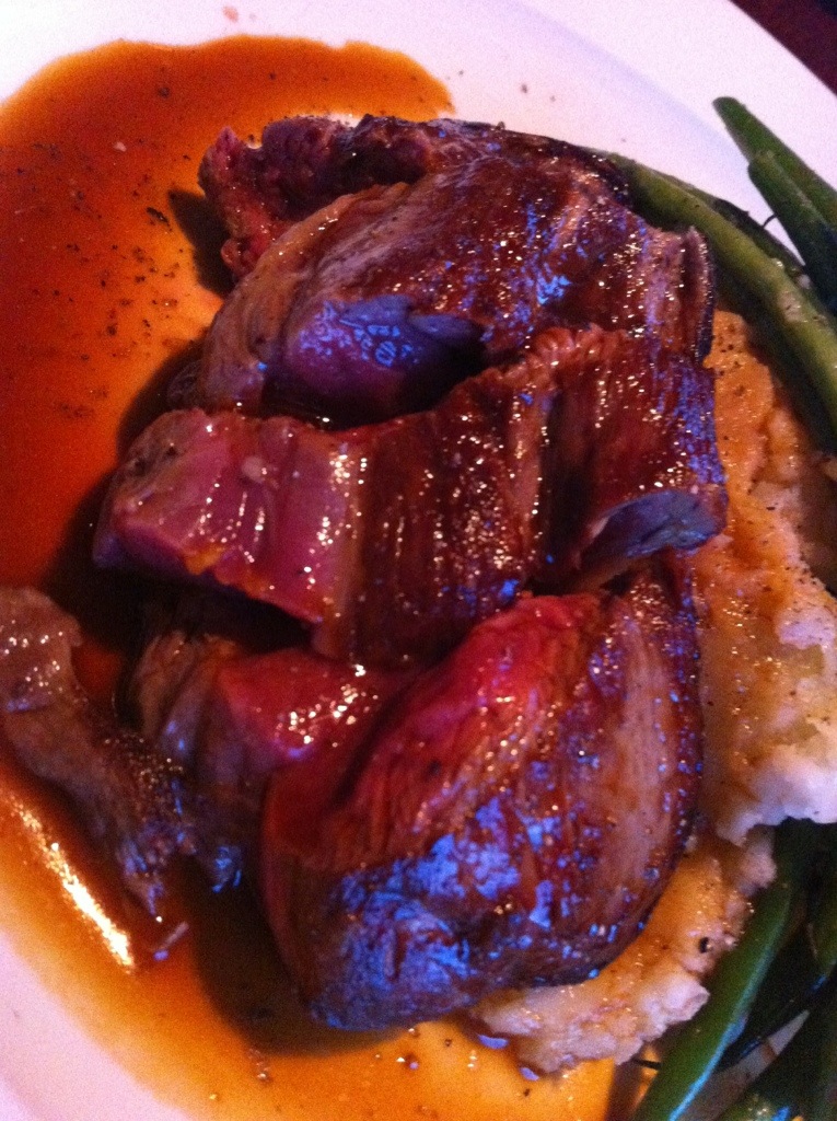 For dinner, Jo ordered the braised cider beet salad (artisan greens, goat cheese, sliced pears and a citrus vinaigrette). She said that this was one of the better beet salads she’s had, of late. It didn’t surpass her favorite (Todd’s Token Salad at Muss & Turner’s), but she really enjoyed it. I ordered the elk tenderloin (thinking of a glorious dinner at Rathbun’s), replacing the standard sweet potatoes with buttermilk mashed potatoes and the haricot verts with which it is paired.