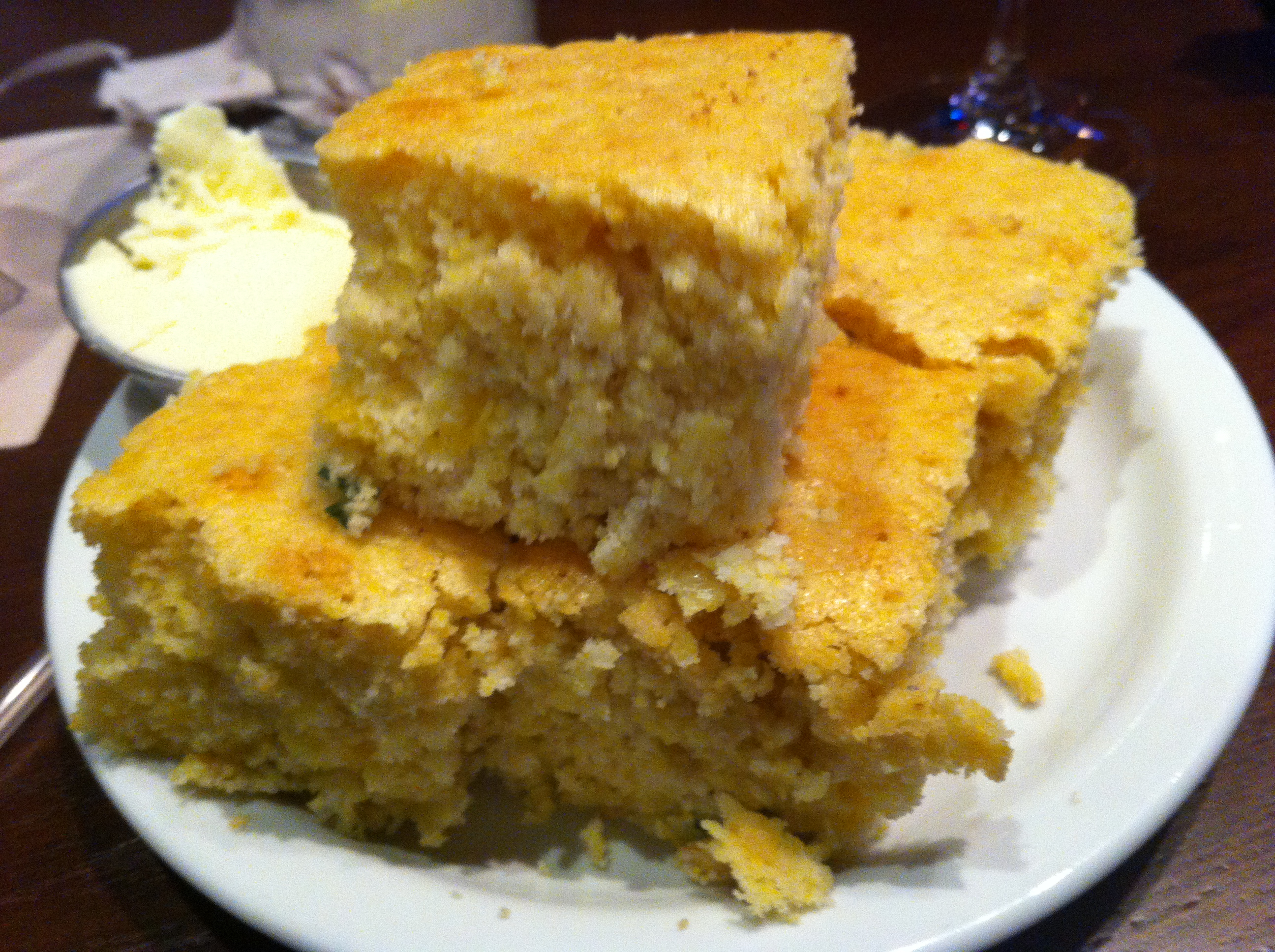 Shortly after we were seated, a plate of cornbread and butter arrived. Let me start off by saying that I’m not a cornbread aficionado. In fact, my favorite cornbread in the world was in elementary school and I’m sure it was made from a mix. It was yellow and sweet. Just like the cornbread sitting in front of us. This meal was off to a good start.