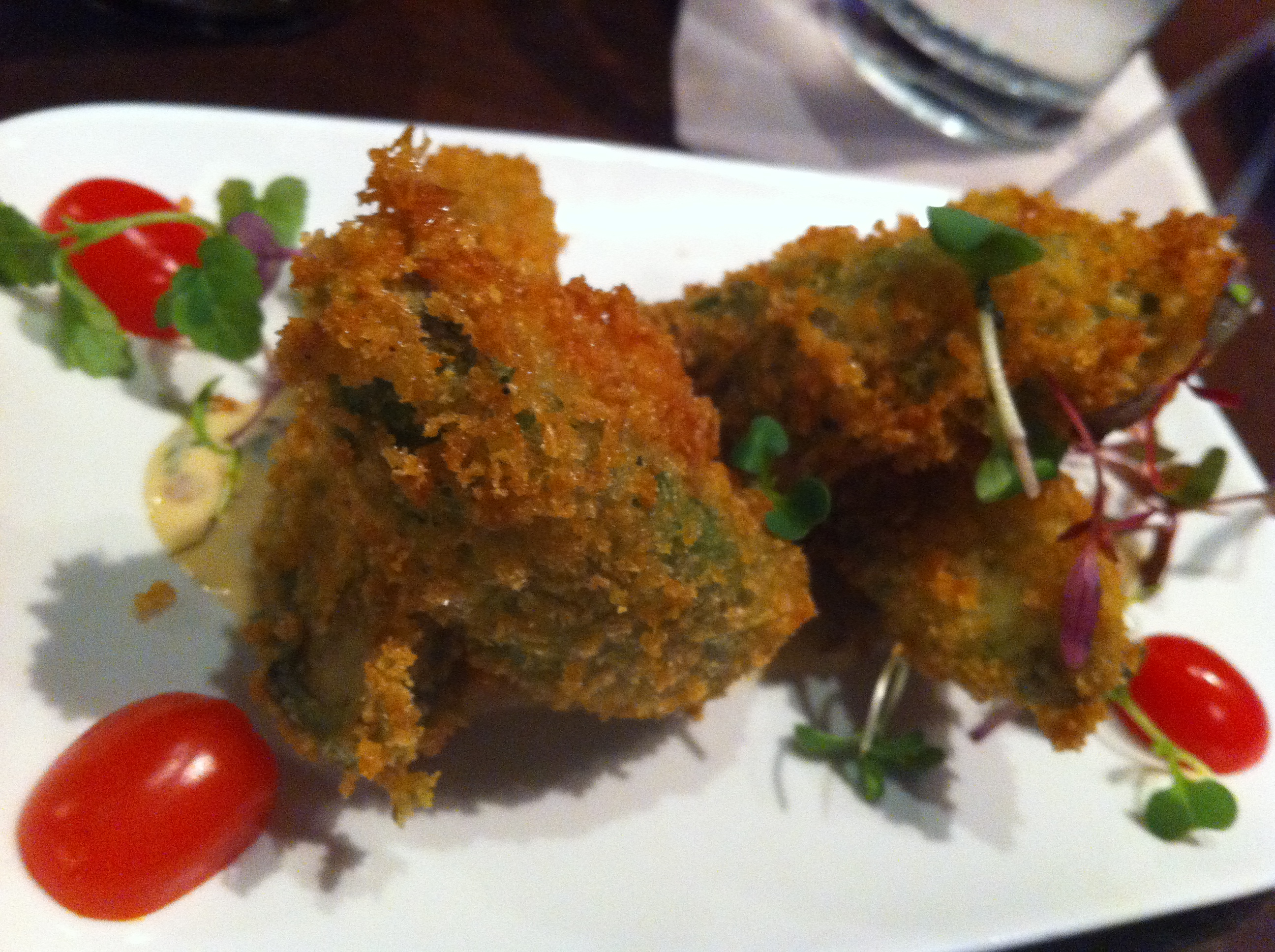 Then we met our waitress, who was exceptional. Thorough. Personable. Conversational. She told us about the daily specials and we started with one of them – fried green tomatoes. They were a hit.