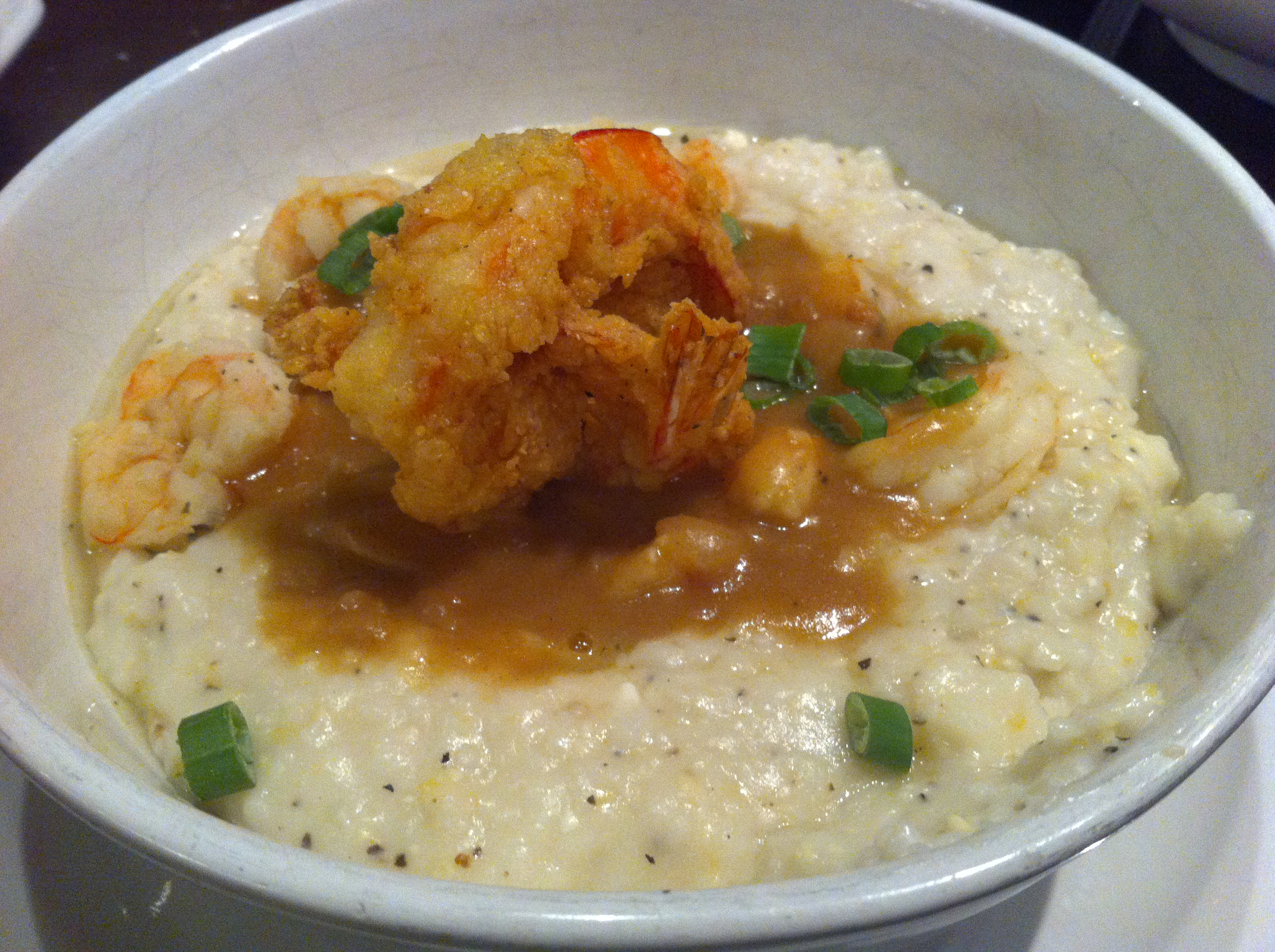 I ordered the shrimp and grits, which were one of the most different presentations of this dish that I’ve encountered. The shrimp were sauteed and served over creamy cheese grits with andouille gravy, with two more shrimp, flash-fried and sitting atop it.
