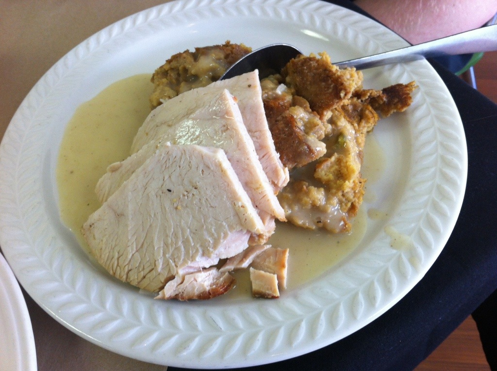 And here is the turkey and dressing. The food was easily equal to the quality of a Cracker Barrel, and parts (chicken livers according to Dad, the fried chicken, the squash casserole) were very good.