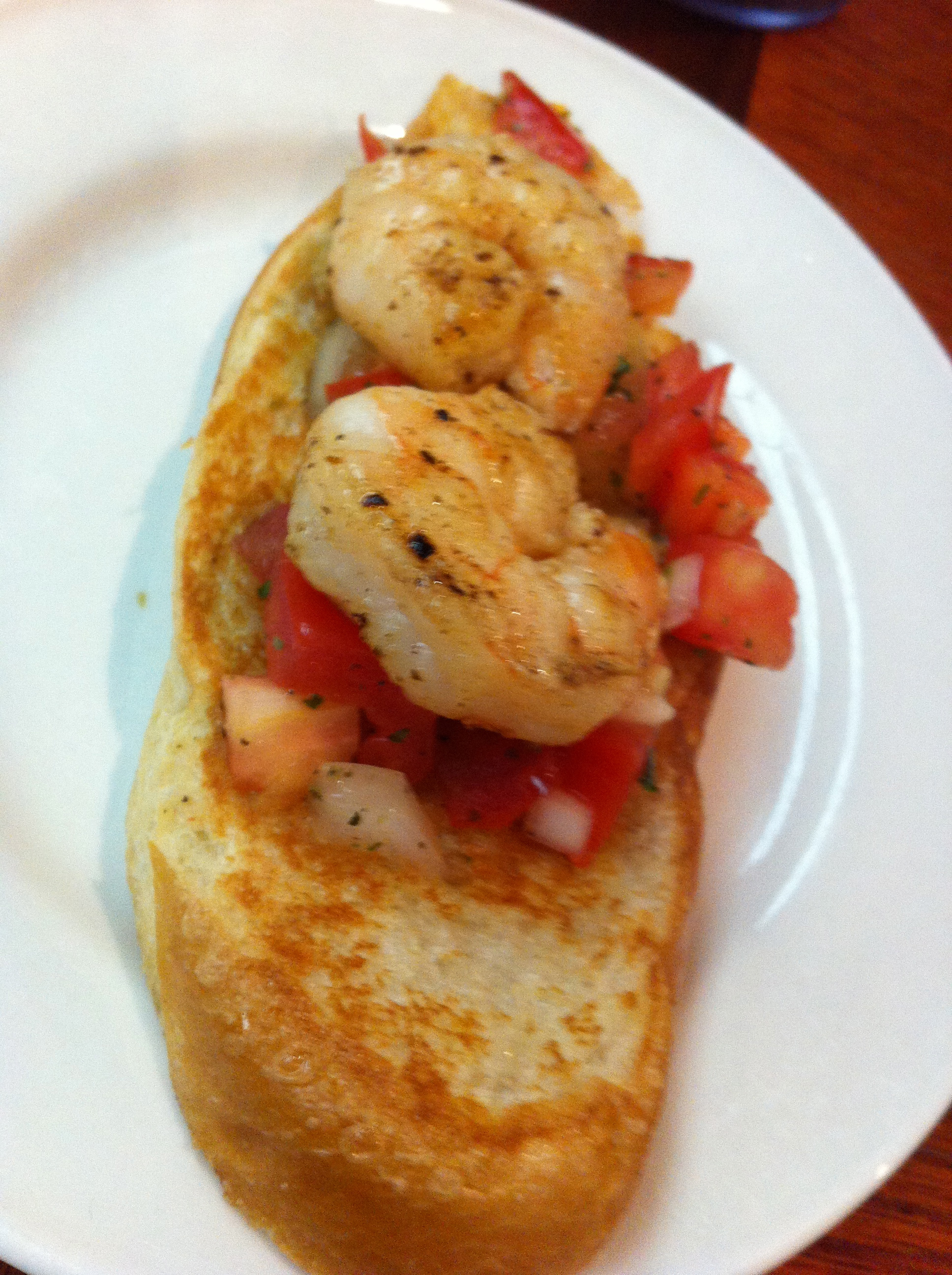 They had ordered a shrimp bruscetta appetizer, which wIMG_5330as not complicated, but was good.  The onions and tomatoes were diced finely and covered in a thin layer of vinegar , topped with shrimp and served on toast.