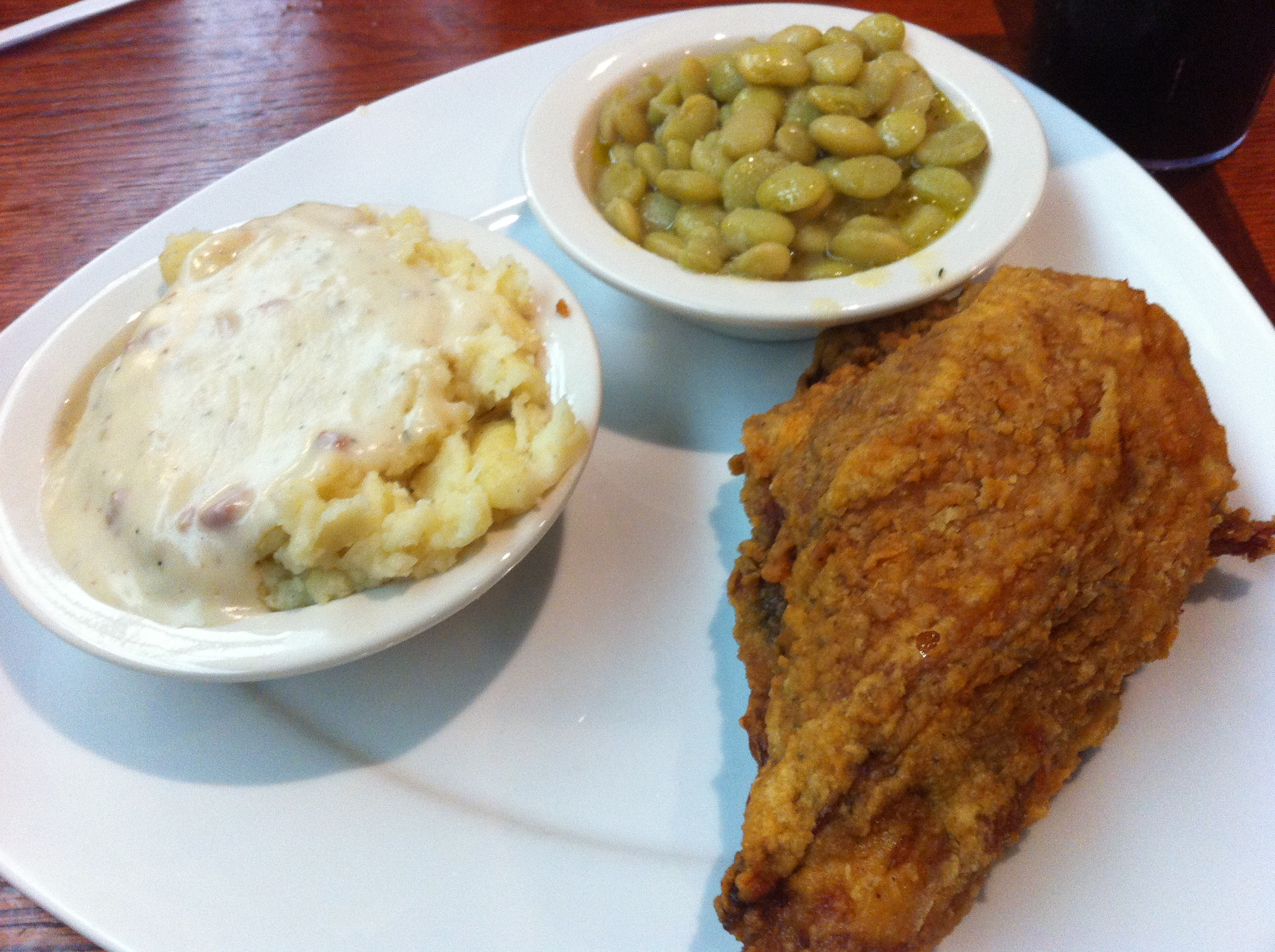 My fried chicken was fine – not great.  The crust tasted of peanut oil and the meat was neither moist or dry.  The lima beans were very good.  The mashed potatoes appeared to have been made from a mix.  We saw some roasted lemon chicken coming out of the kitchen as we were leaving that looked tasty.