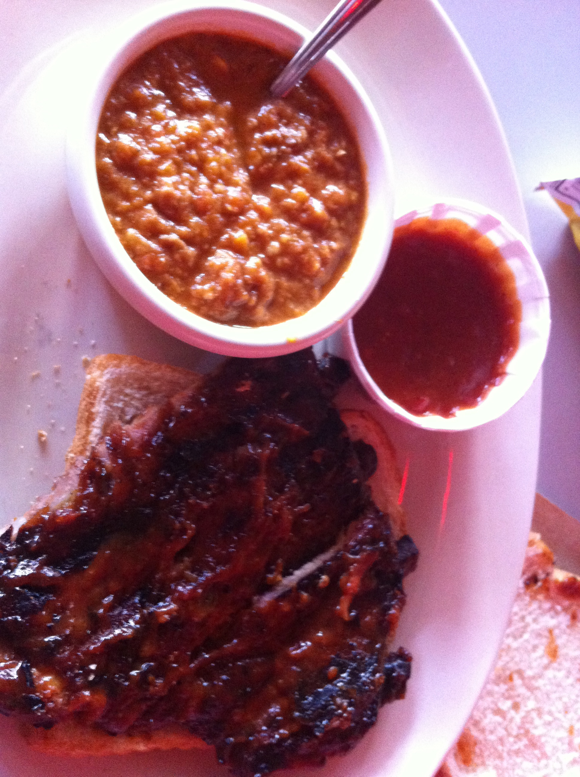 ” I like to eat the ribs without sauce and dip the bread in the sauce.” Amen. Good BBQ doesn’t need sauce, but plain white bread sure does.