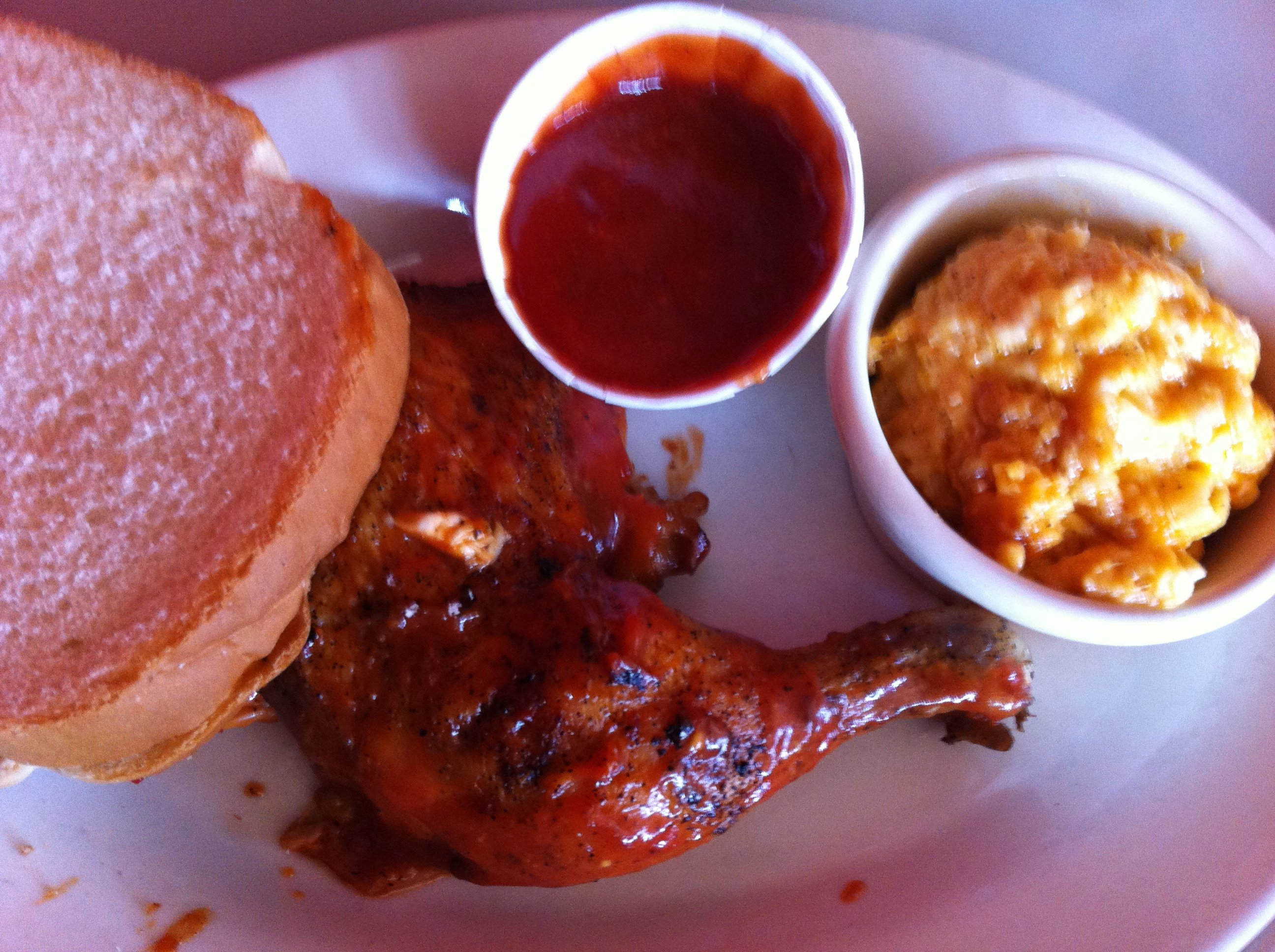 On the second visit (tonight), I again ordered the pork sandwich, this time with a 1/4 chicken with mac-n-cheese.