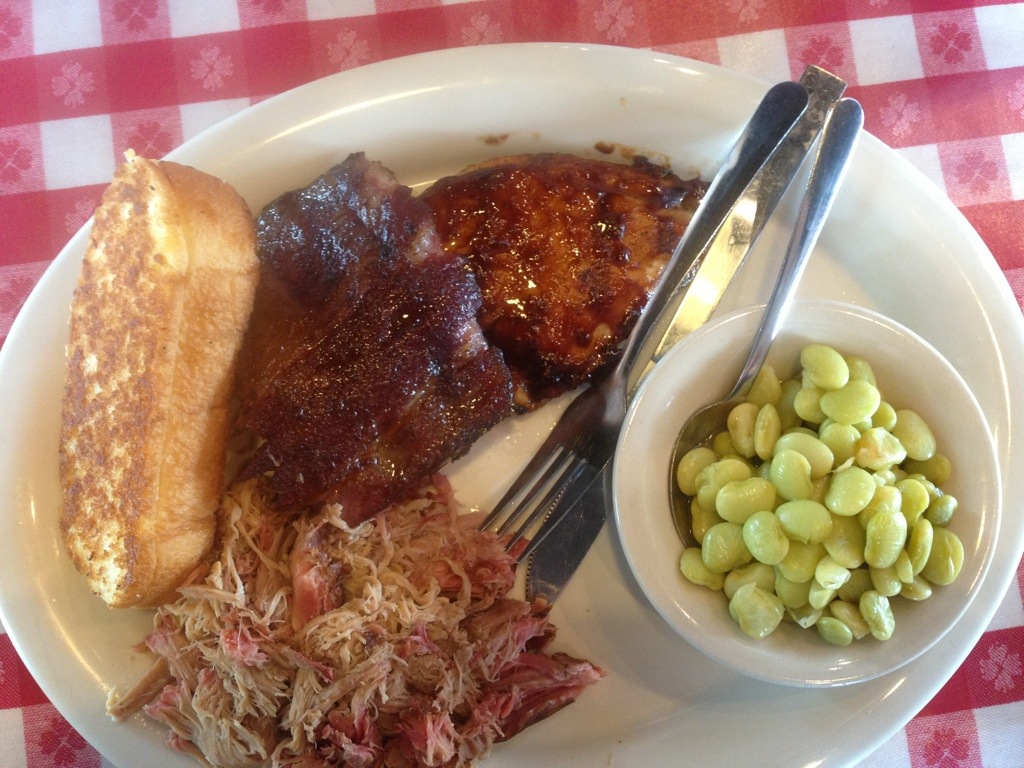 I chose the sampler platter (ribs, mesquite grilled chicken and pork) with one side (lima beans) and a choice of cornbread or “barbecue toast”.