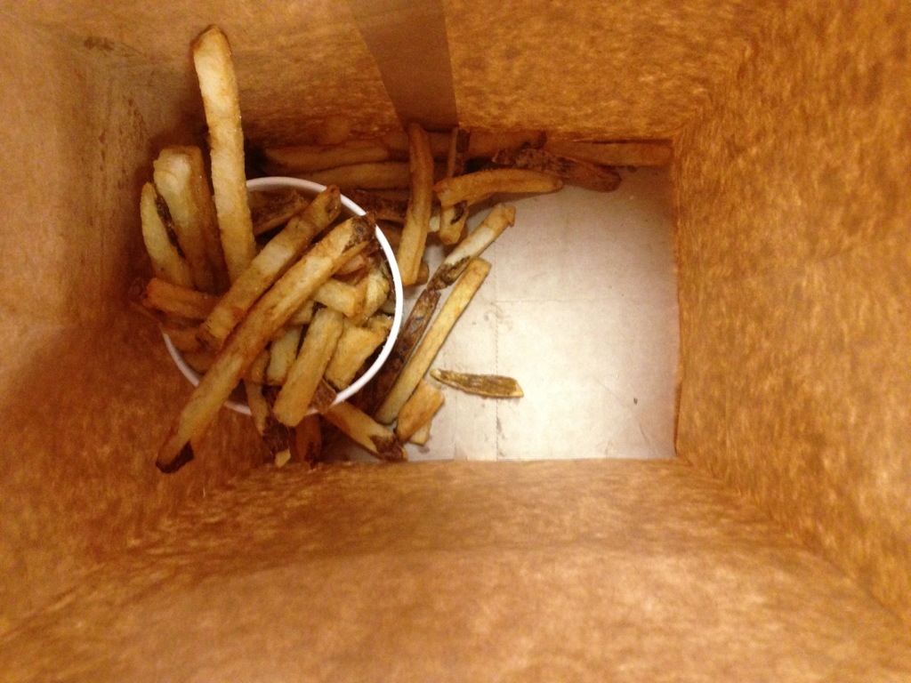 that’s the bottom of the bag, after the burgers have been pulled out and a large order of fries remains. It fed the three of us. And the fries are cut fresh on site, every day. And they cite the source city (often farm) where the potatoes came from on a chalkboard near the order counter.