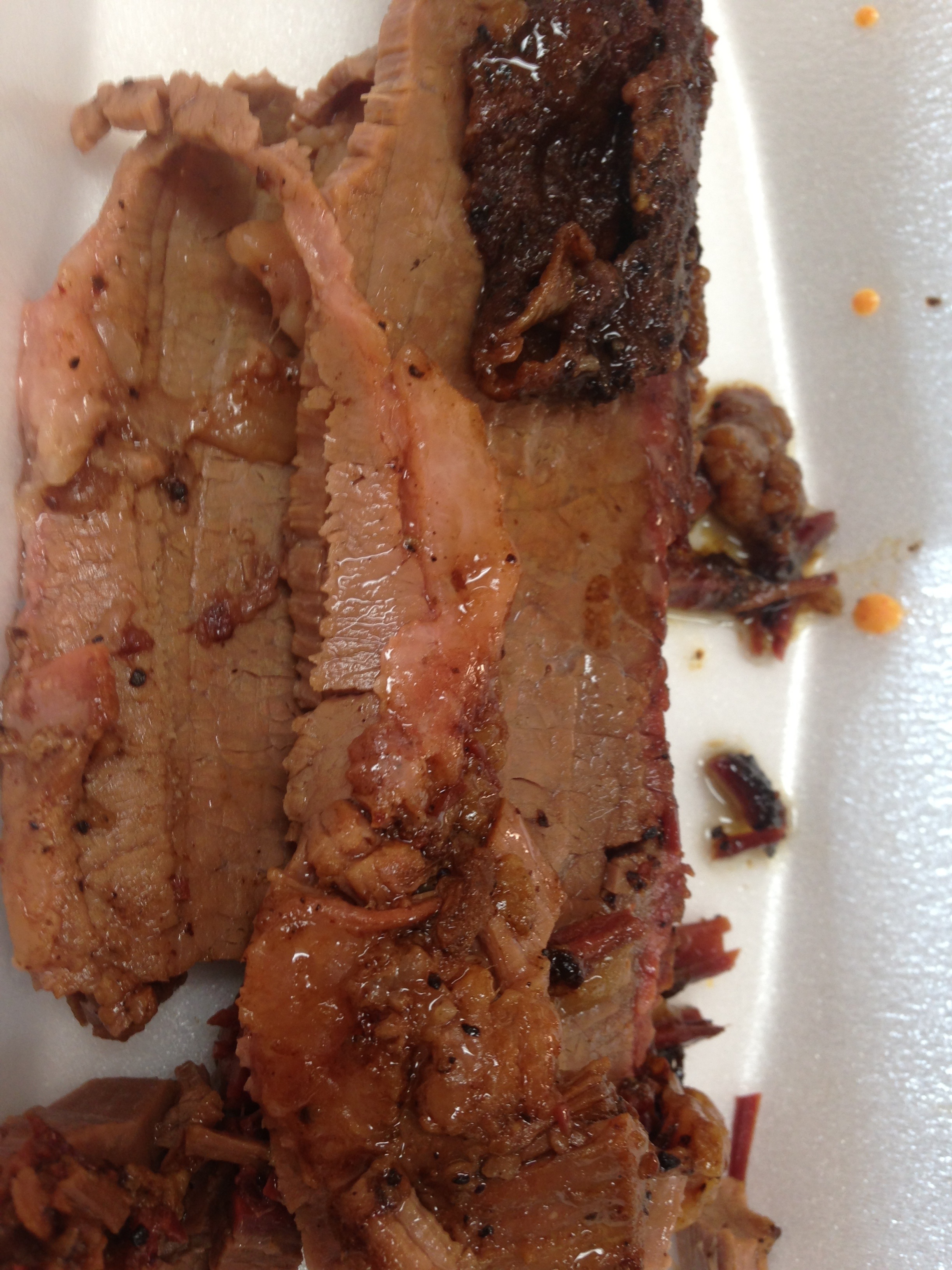 The brisket was excellent, 20130823-212839.jpgmoist, fork tender, and very well seasoned.  I noticed as they sliced the brisket (which they kept wrapped in plastic wrap when they weren’t slicing it, in a warmer) that they scooped the juice back onto the brisket itself before wrapping it to keep it moist.  It appeared to work.