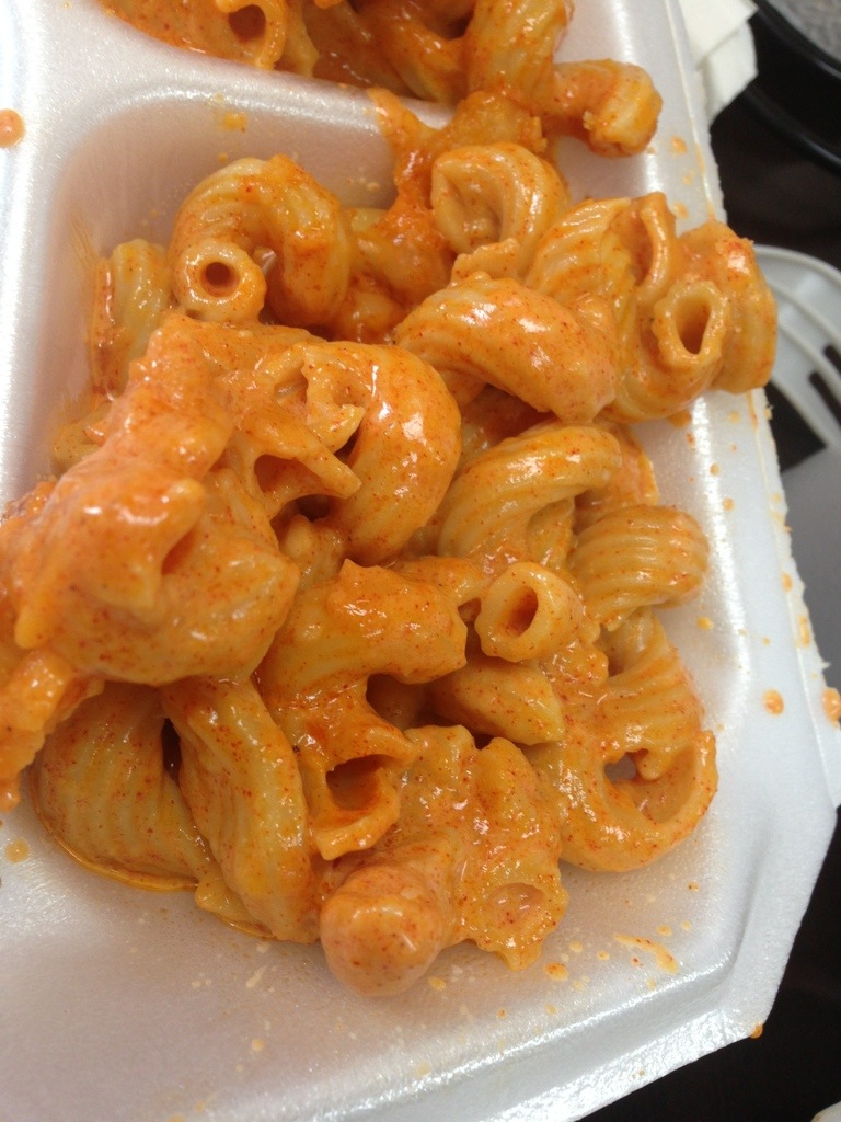 For the side choices I was going to get macaroni and cheese and green beans, but as I was ready to place my order they said that green beans were about five minutes away (Marie ultimately got the ones she ordered, and said they were tasty).  I was willing to wait the five minutes, but then they then said ten minutes (maybe fifteen) so I decided on double mac-n-cheese, solely because it looked awesome. 20130823-212906.jpgWith that look, I was expecting some spice (there appeared to be cayenne flakes, or the like, in the sauce), but there wasn’t any, nor much flavor beyond that of macaroni and cheese.