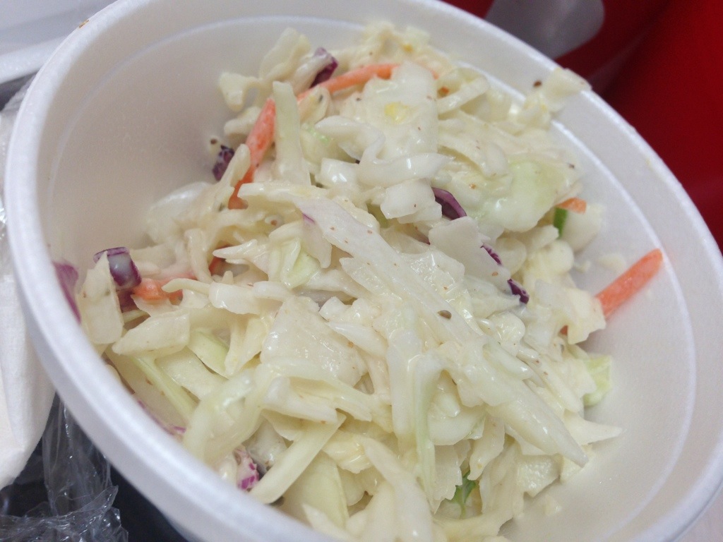 I decided to go with a rib plate (five ribs + two side – here are the ribs)20130823-231847.jpgThe ribs were cooked so tenderly that the meat absolutely fell off the bone.   They were kind of thin, but really meaty side to side with a solid char across the slab.  I was willing to share some, but it was next to impossible to get any on a fork to pass to anyone else.  I went through many paper towels.