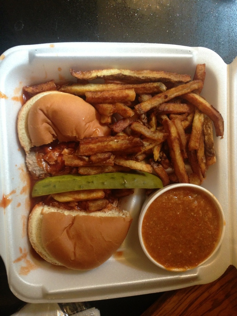 econd was the sauce itself – the pork was chopped (not finely) and slathered in a sweet barbecue sauce. Slather is a generous word as the meat was actually floating in the sauce. They say in big letters behind the counter “smoked over hickory”, but I honestly couldn’t taste the meat over the sauce. Maybe the key would’ve been eating in, because the plate that I saw passed thru the window had finely shredded pork served dry. The fries were nothing but small ends, mostly burned, and the stew was bland, at best, so overall it was disappointing. It’s rare that I don’t eat all my food but I didn’t even come close . It just wasn’t that good