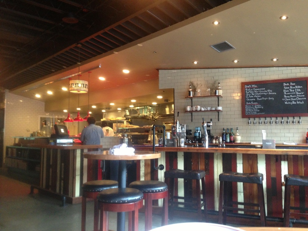 Following Ron Eyster (who also owns Rosebud and the Family Dog), on Twitter *, I had been eagerly anticipating the opening of his new pizza restaurant, timone’s local pizaa joint, for months. This evening as I was heading in town and driving through Morningside, I thought it would be a great opportunity to stop in. Arriving around 5:30, I was given free rein as to seating (inside or out, booth, table or bar) and chose a high top at the back of the bar area. Immediately behind the bar and straight in front of me (and on the right in the picture below) was a blackboard with draft beers, featured wines and house made sodas.