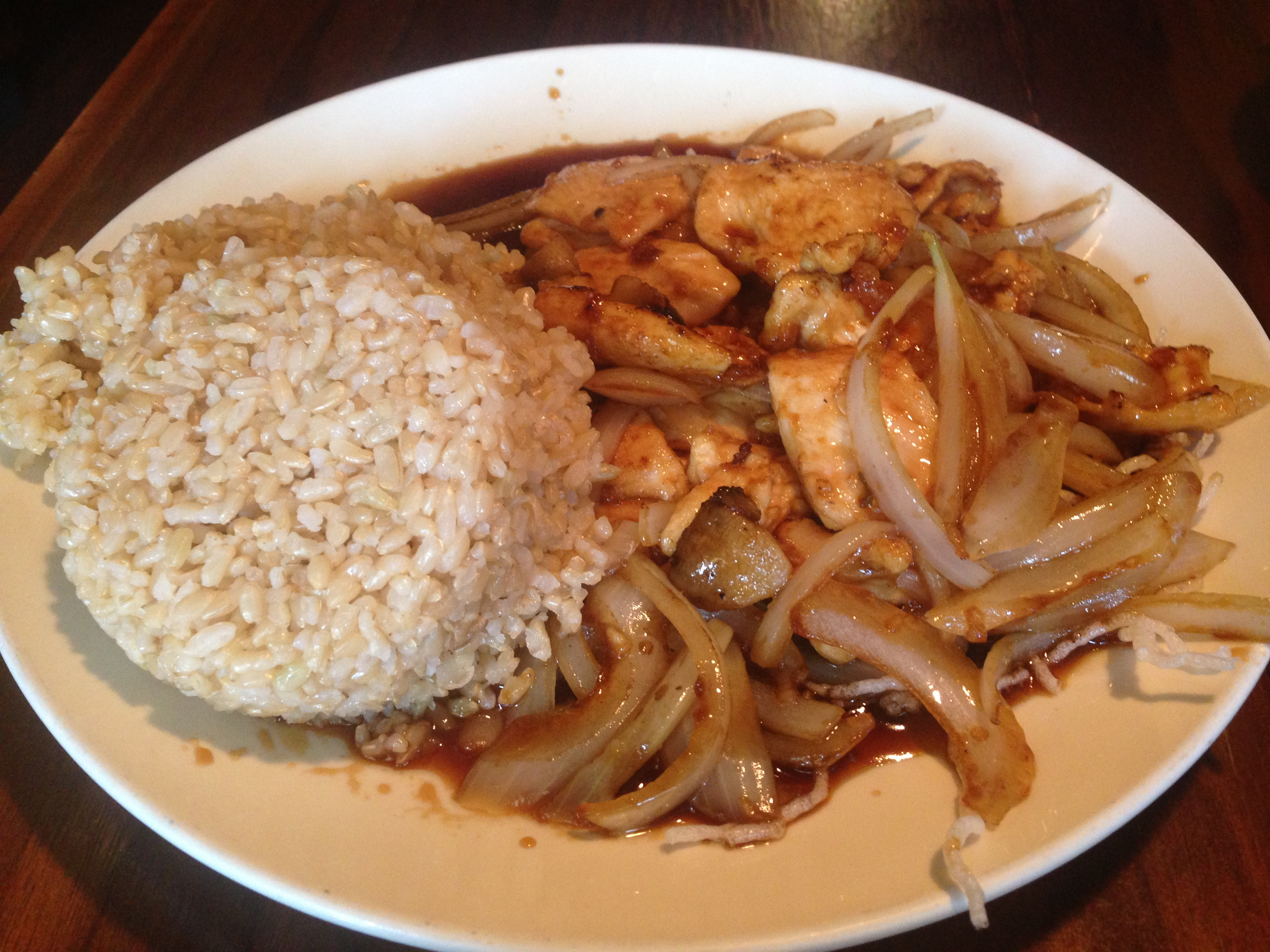 a simple dish of grilled white meat chicken, which I ordered without the green onions. I alternate between the Mongolian and General Tso’s chicken. I do think that if the General Tso’s were made with white meat, I’d order it all of the time.