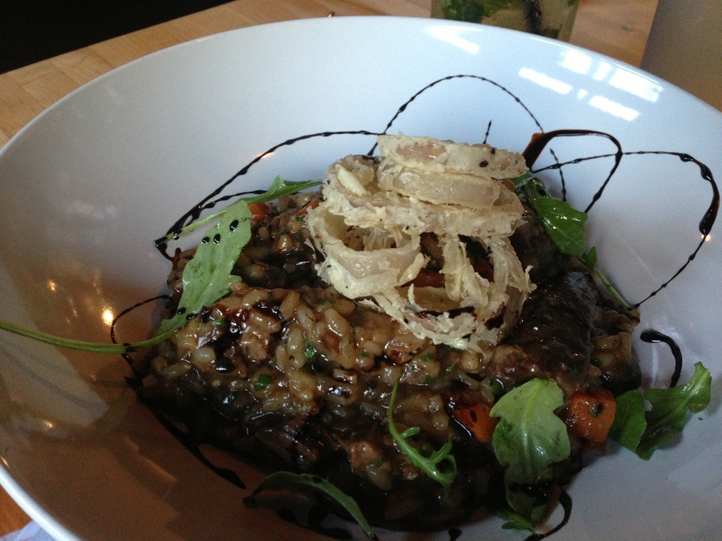 which was well received. Both plates were clean when they returned to the kitchen. There was almost a skirmish over the undisclosed fried onions atop the risotto, between the ladies. The short ribs were tasty – several bites were shared with me. But the dish looked like a hot mess, not very appetizing.