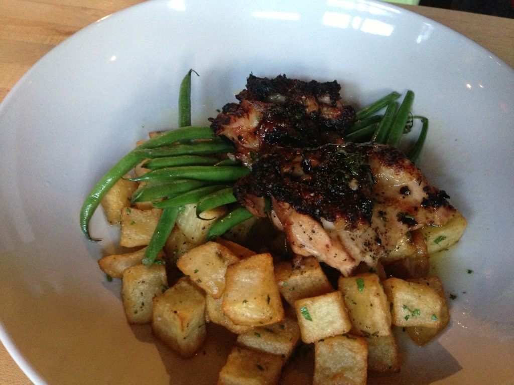 The chicken was two boneless thighs, with roasted potatoes and haricot verts and was, by all reports, good.