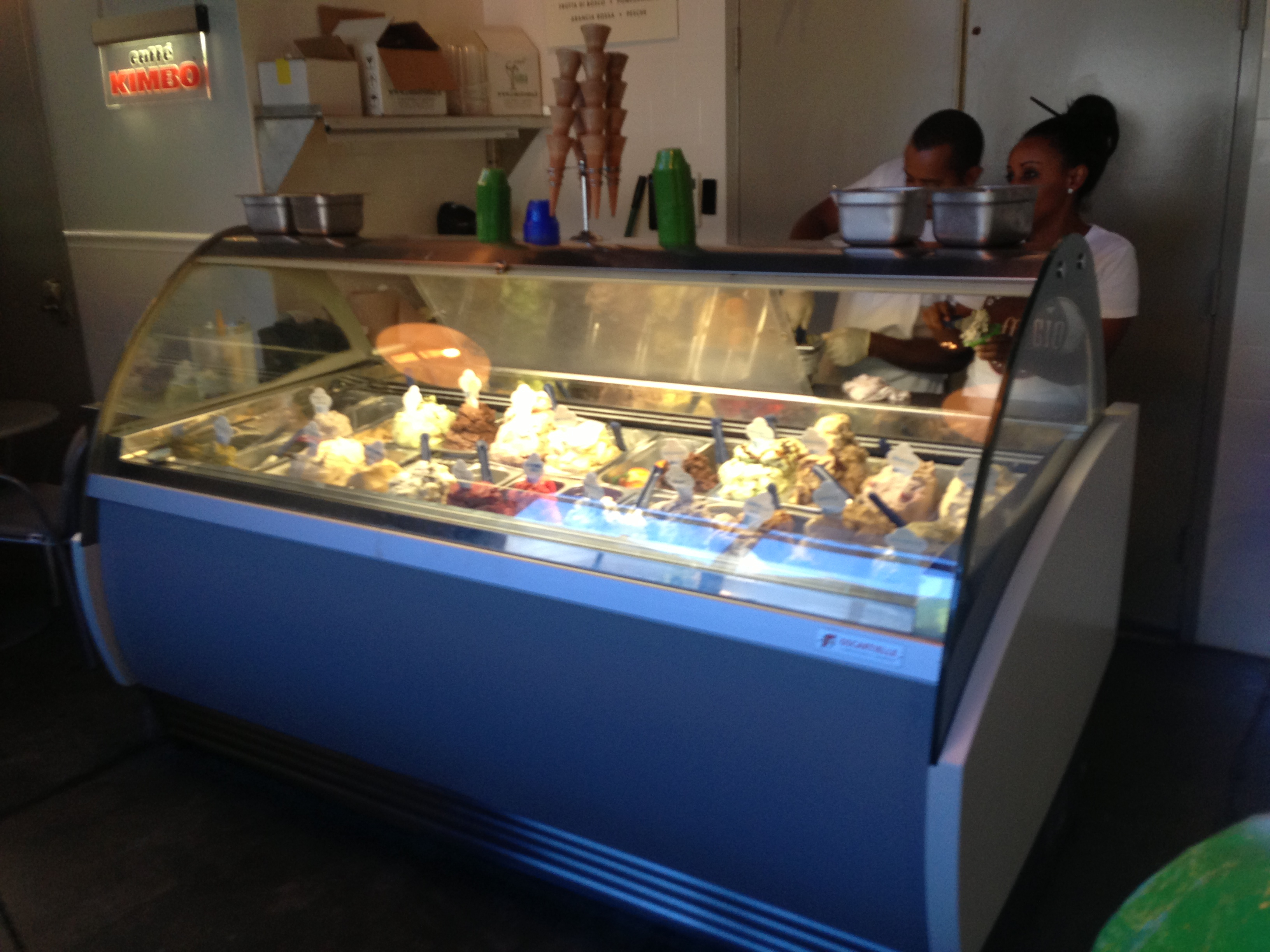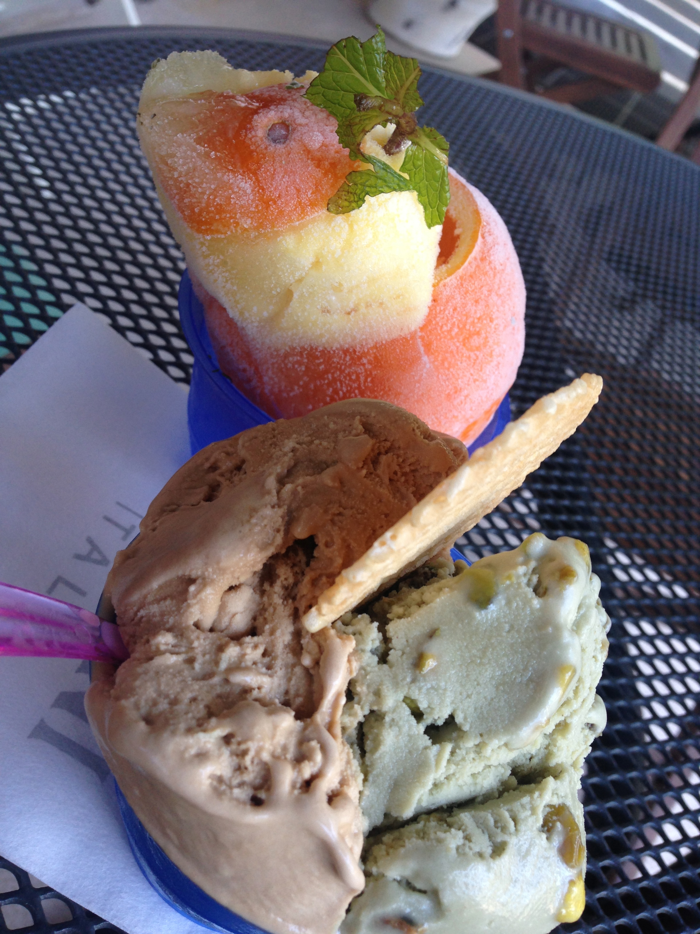 They had ten to twelve flavors, mostly chocolate or nut based, with a couple of fruits. Jo chose a split cup with pistachio (generally her favorite flavor) and salted caramel (apparently the “it” flavor of summer based on its prevalence around town in various incarnations) and I went with the orange sherbert.