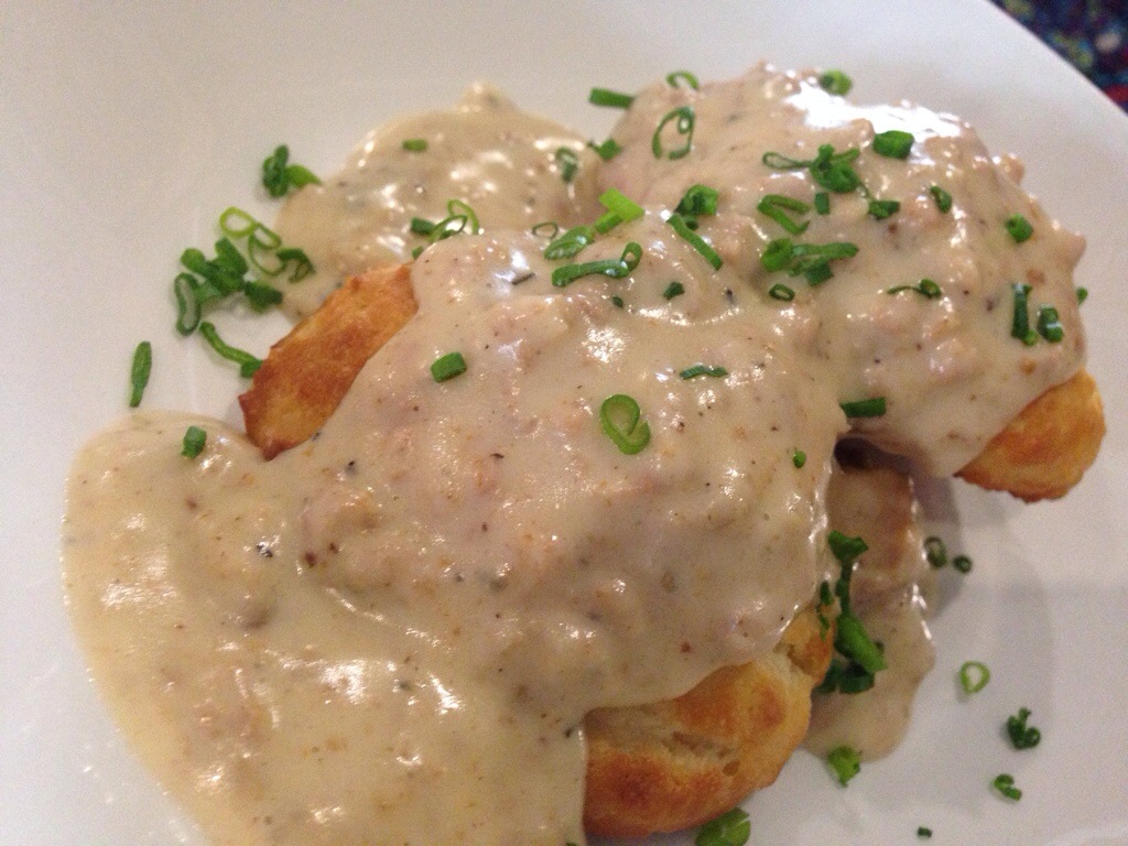 The biscuits and gravy came out designed to split – two biscuits covered in a thick light brown gravy. The gravy had a little bit of pepper in it and a little bit of sweetness to it. And the biscuits were very flaky and very crumbly. And very good. This was great start.
