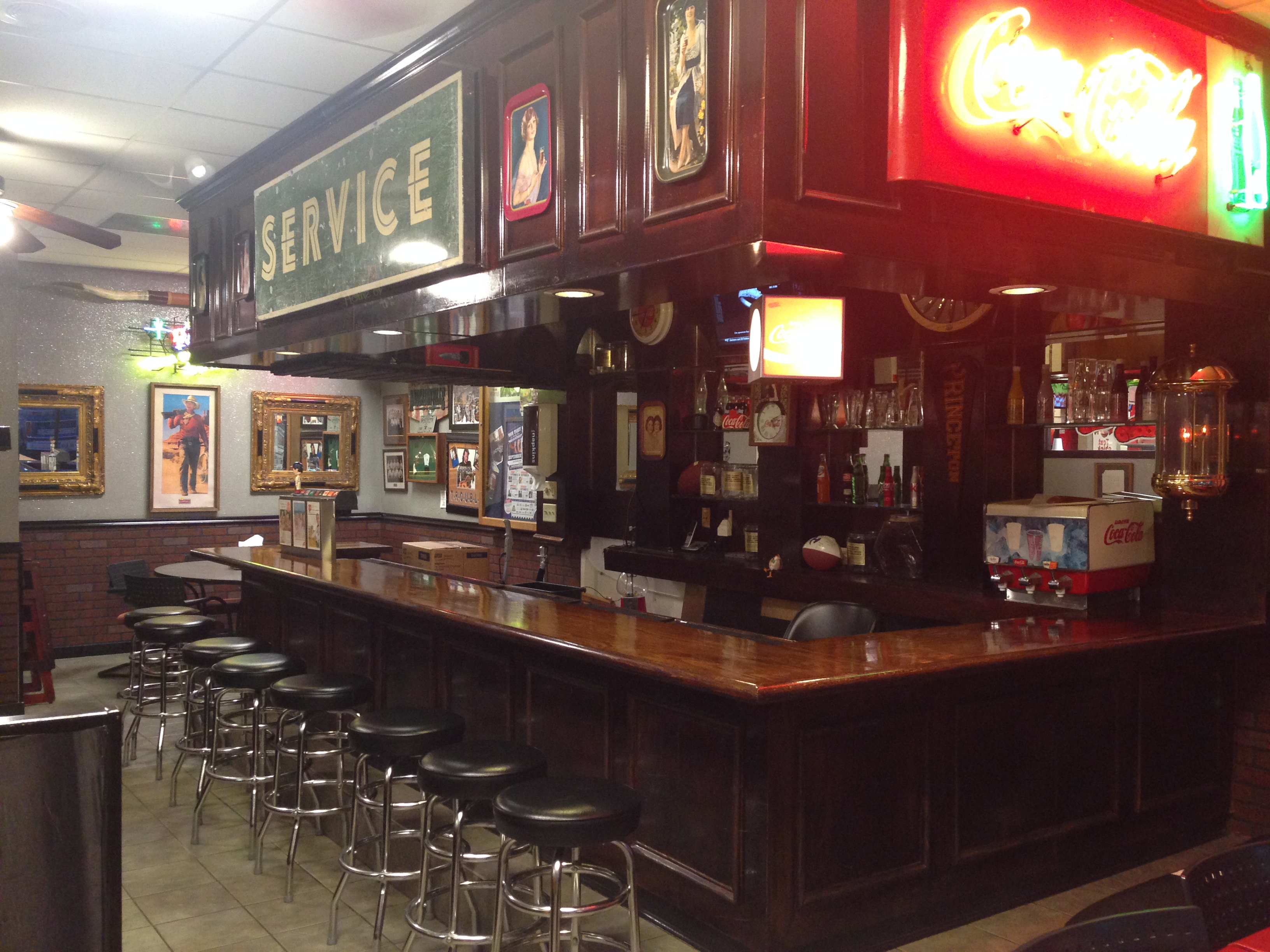 Adjacent to, and off to the right of the dining room, there was a large bar area, separated by a wall from the main dining room, with doors at each end. I investigated while we waited for our food and found that the only typical bar accoutrement to the bar was a soda fountain. Maybe they don’t have their liquor license? It could also, possibly, be used for a banquet room, but the seating would seem awkward.
