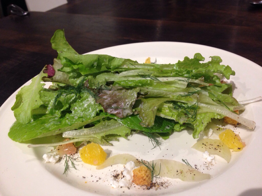 The next dish, a salad of local lettuces, with winter citrus, goat cheese feta and a buttermilk vinaigrette dressing,