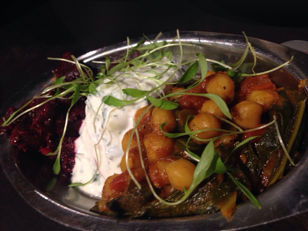 an Indian spiced beets with riata (the dill yogurt sauce from Indian cuisine) and stewed chick peas. The riata was very well prepared and the chick peas, which were cooked in a masala tiki sauce, were good, as well. The beets, which were curried? Not so much.
