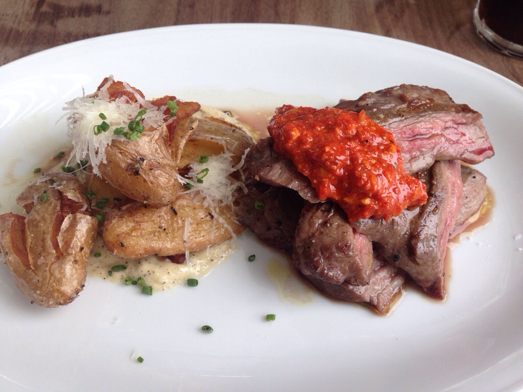 I ordered the wood roasted skirt steak with punched potatoes, romesco (nut and red pepper sauce) and cacio di pepe aioli (an aioli made with pasta and pecorino Romano cheese).