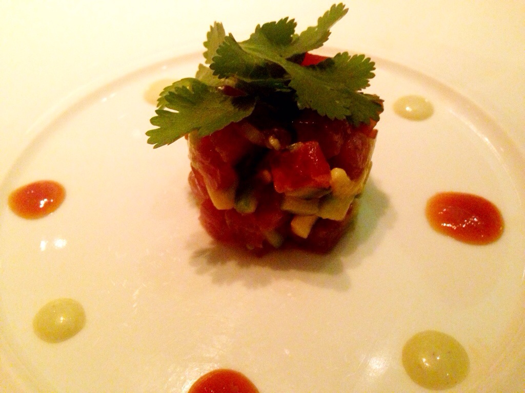 About ten minutes later, after the bread basket (a muffin with a blackberry on top, whole wheat, semolina and lavash), the first plate arrived, a tuna tartare,