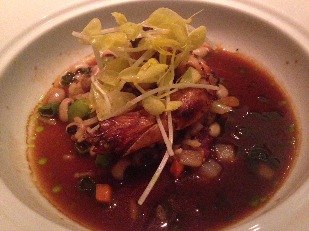 topped with sprouts (peanut sprouts, maybe?), in a Tabasco demi-glace, atop a bed of “Texas hopping John” (comprised of black eyed peas, smoked pork hock and cipollini onions). The shrimp was fork tender and I really enjoyed the Tabasco with the shrimp and peas.