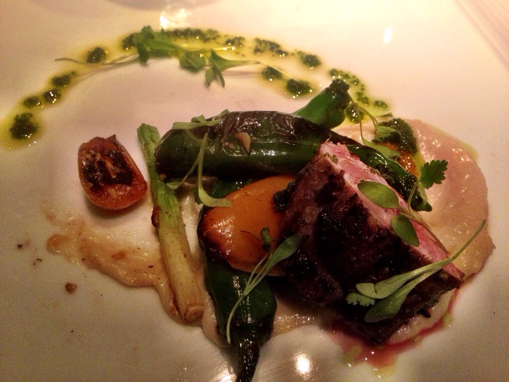 with blistered shishitos, roasted kumquats and baby bok choy, on a cashew purée, with green chile-ginger oil (the swoosh at the top of the plate). The duck was as tasty as I’ve ever eaten and fork tender. We discussed how many handfuls of cashews you’d have to crush to get that much purée, and couldn’t derive an answer. While I’d never heard of such a thing, it was exactly what you’d expect of the dish – slightly sweet and very nutty. The shishito peppers were smoky and when dipped in the chile oil, had quite a kick. When I made a couple of forks of everything on the plate, except for the cashews, it was quite a mix: the smoke and heat, the citrus sweet and the tender duck.