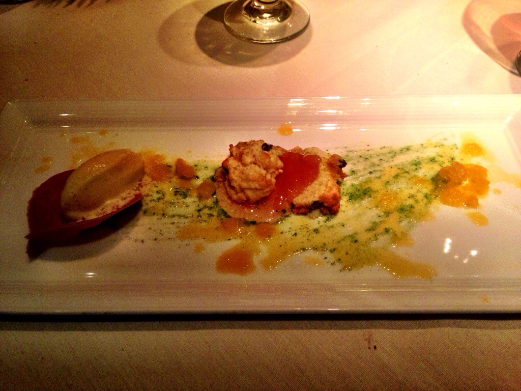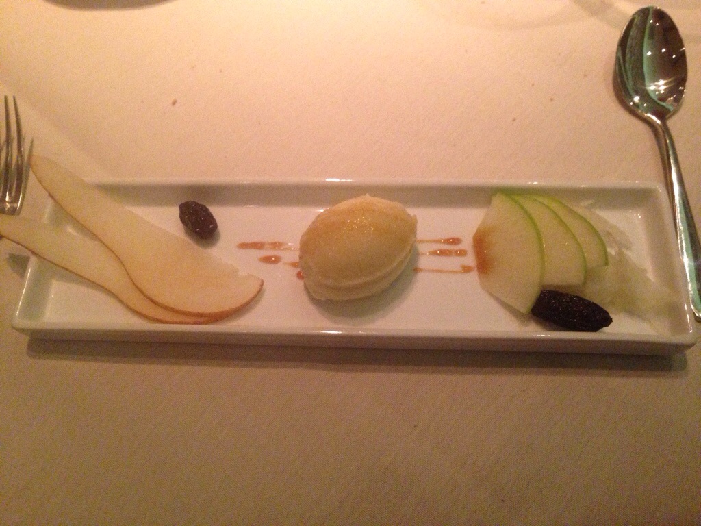 sliced apples and pears, an apple sorbet, toasted grapes and shaved fennel. The sorbet was even more apple-y than the slices, and they had plenty of flavor. I had never eaten toasted grapes before, but the flavor seemed much more concentrated – almost as strong tasting as Southern Baptist communion “wine”. The shaved fennel surprised me, as it didn’t taste as much like licorice as I expected. Maybe that’s a function of the part of the plant that was served?