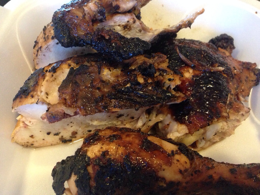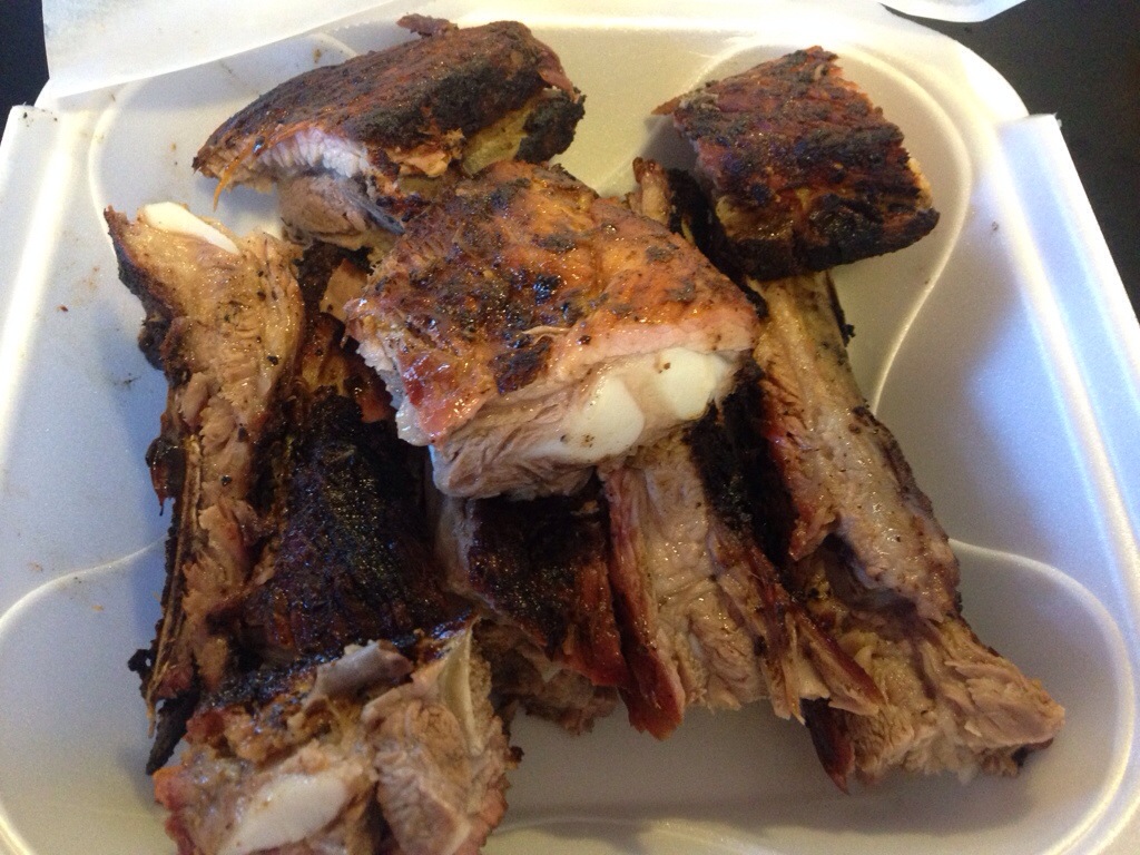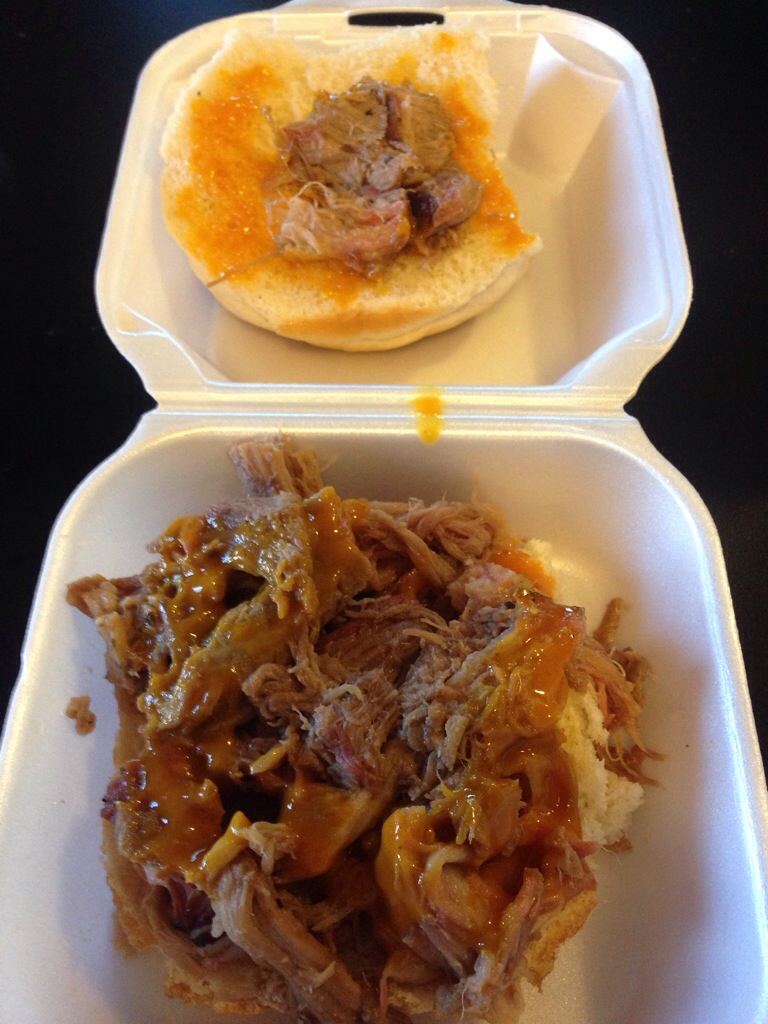 I found more ribs, sitting atop three pieces of chicken. I said something to the lady at the counter about the combo plate and she said, “no it’s ribs and chicken” and I think at that point she realized that she had told me pork and chicken. But I now had a giant mound of ribs to eat, along with the chicken. While I was working my way through the ribs, she came out of the kitchen with a small pork sandwich for me to try as well (she said that it was smaller than a regular sandwich – more of a sampler). I greatly appreciated her thoughtfulness.