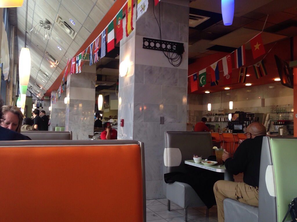 After a couple of days snowbound by the 2014 Snowpocalypse, I had an afternoon meeting in the Georgia Pacific building in Five Points. Arriving about an hour before it was scheduled to start, I wandered the nearby blocks (avoiding icy spots and residual snow piles) looking for a lunch spot. It was then that I saw the Landmark Diner, right across the street from the Rialto Theatre, at the corner of Forsyth and Luckie Streets. I had seen this place before, driving through, but as parking all around is in pay lots and it didn’t seem like a lunch I’d be willing to pay to park to eat. As I was already in the neighborhood, now was the time. Walking in, I was seated near the far side of the restaurant from the door and saw that the place was populated with families, GSU students and office workers from nearby.