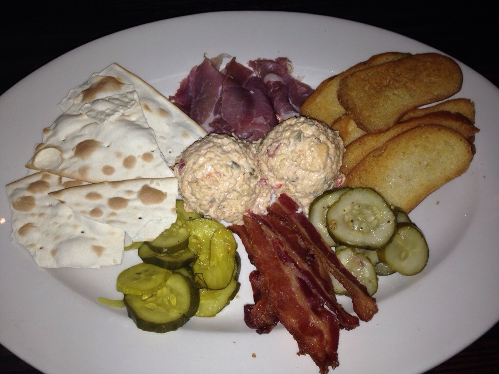 The complimentary portion of the evening included a starter for the table along with a meal for everyone. With five of us, we decided to start with two starters: 1) the picnic sampler (shaved Benton’s ham, candied bacon, pimento cheese, breads and a couple kinds of pickles).