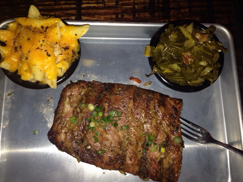 5) The lemongrass coconut short ribs with greens and mac & cheese. These belonged to my beloved, so I was able to taste a little – the baby back ribs did not taste strongly of either lemongrass or coconut, although they were slightly sweet and were good. The turnip greens were a little sweet but adding some of the vinegar barbecue sauce on the table made them taste more traditional and the mac & cheese while very cheesy on top, could have used more cheese throughout the rest of the dish.