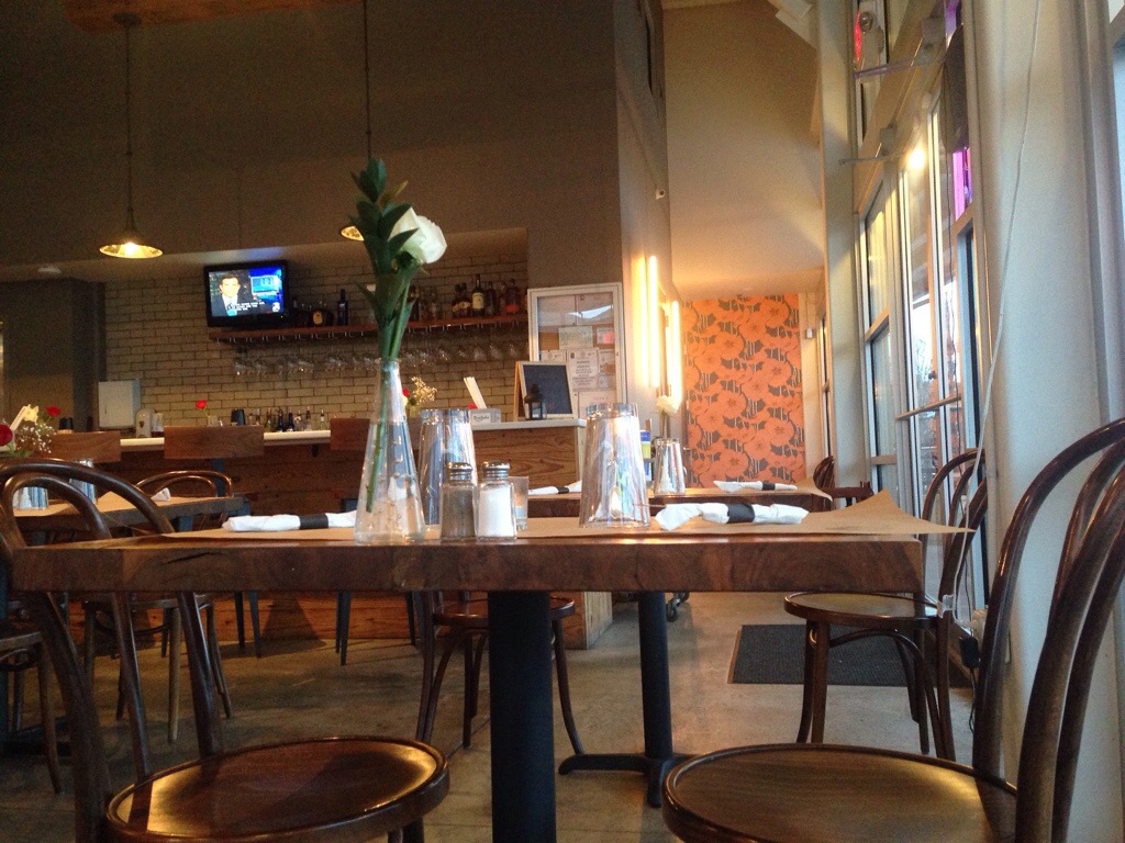 Formerly opened as Swit Bakery & Cafe (as a bakery-cafe), it was re-imagined as a bistro-bar and re-opened / re-branded last fall. It is designed like most every other restaurant that opened last year – neutral colors, high ceilings and lots of wood. I did like the two pair of giant doors that were used as room dividers.