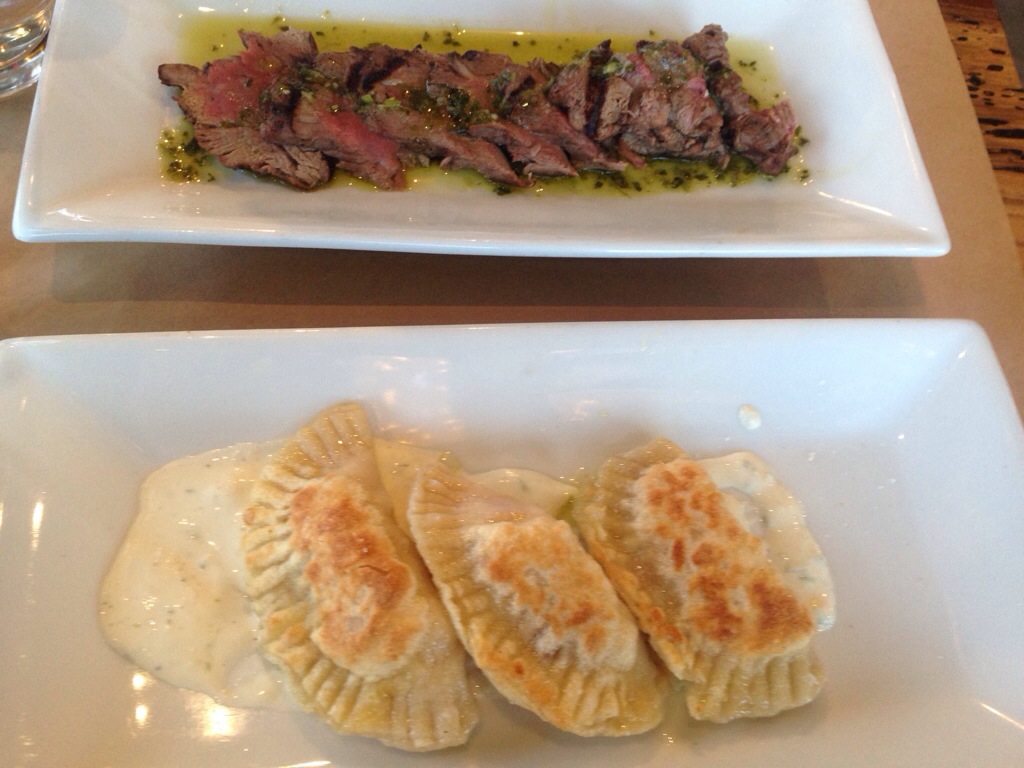 the hangar steak, with chimichurri sauce and bacon pierogies. For as long as we waited for food (and I can’t believe it was because the kitchen was overly busy), I was surprised that only one starter came out hot (the pierogies). It was as if they finished one and waited for the other. I did enjoy the little bacon and potato filled dumplings, although they were kind of doughy. But, as they were clearing the table, the server asked me if I wanted to keep my fork. I had left it on my appetizer plate, expecting they’d deliver another. I would have thought it obvious that I preferred not to keep it – is a clean fork too much to ask for?