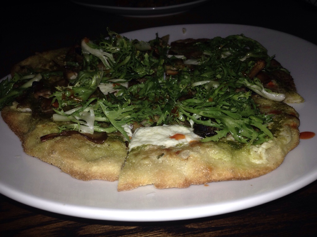 charred Tucker Farms greens, lomo (salted, dried pork tenderloin – that looks like prosciutto in the photo), chevre fritters and pickled citrus vinaigrette. The salad was warm and was well received. That plate was returned empty to the kitchen as well. I had a bite of the lomo, which was salty and delicious. She followed that with the flatbread –