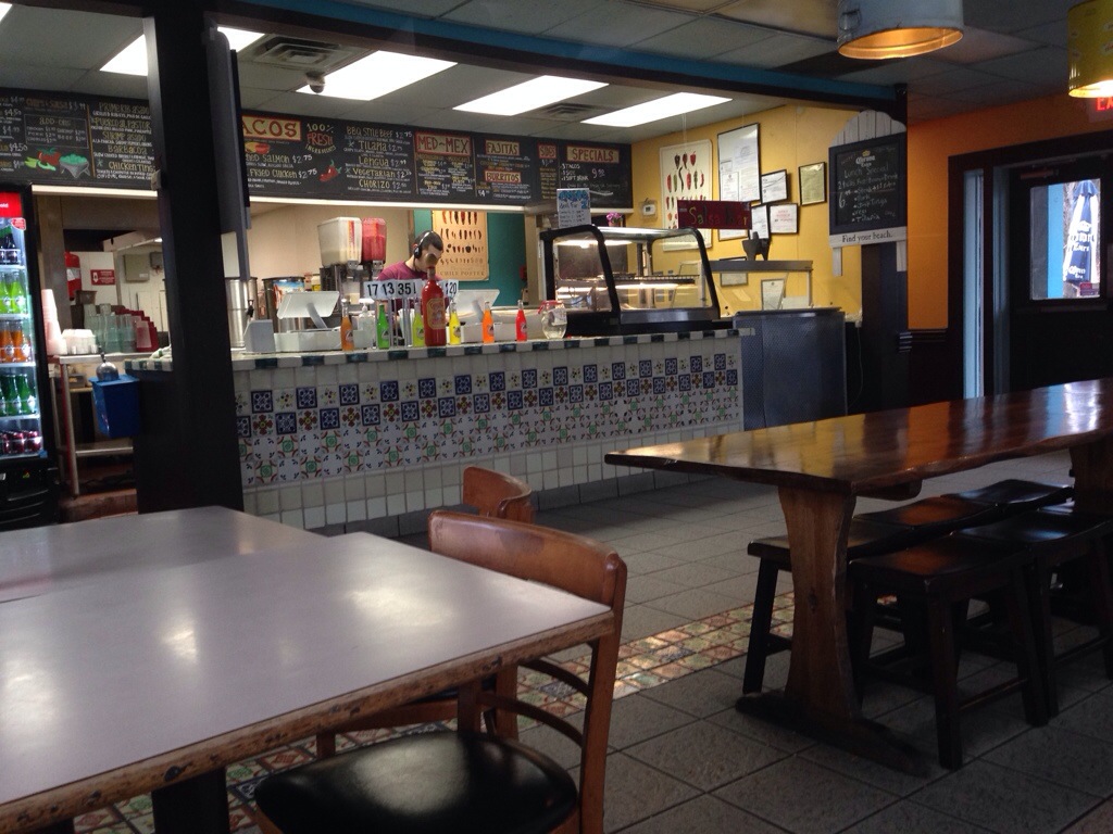 Walking in, there is a counter with a blackboard based menu above it to the right and a bunch of seating to the left.