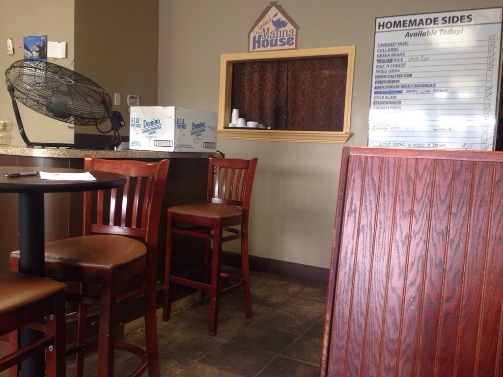 After almost a six-mile hike at Kolb Farm, we had worked up quite an appetite. As we were almost in Marietta, I remembered reading, in the eater.com article about Alton Brown’s favorite spots that he was fond of the “super funky soul food” at Manna House. We were less than ten minutes away from downtown Marietta, so we headed through the square to the intersection with Fairground Street. A left turn and it appeared in less than a block on the left, sharing a building with a package store.