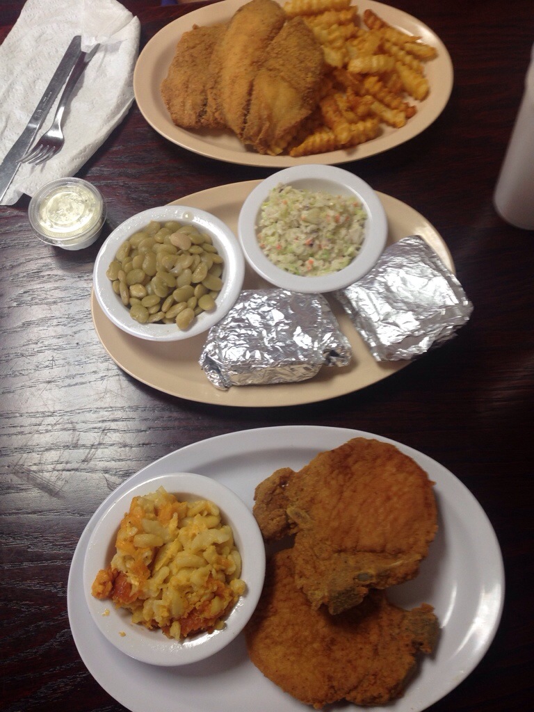 Jo had the fried tilapia (which was cooked to order), slaw and fries (which had been cooked before we ordered, based on the way they tasted). Coupling those fries with the Hunt’s ketchup on the table, I was glad that I wasn’t trying to eat those.