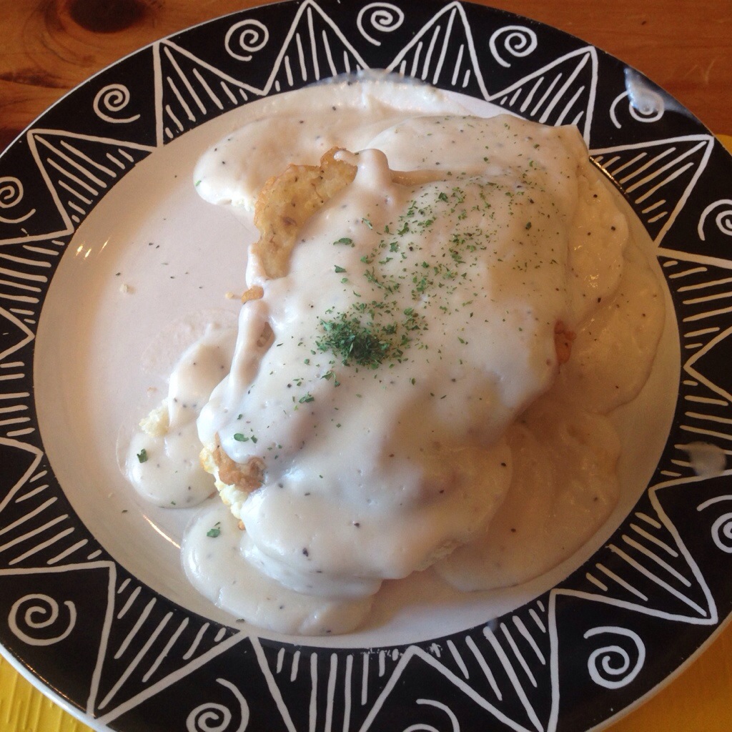 I ordered one of the daily specials – country fried steak over biscuits with gravy and a side of eggs