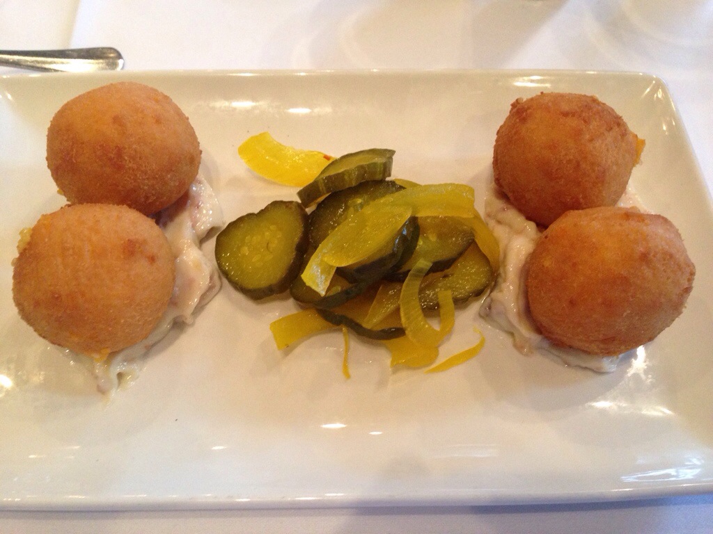 I started with the pimento cheese and grit fritters, served with bread and butter pickles and a country ham aioli.