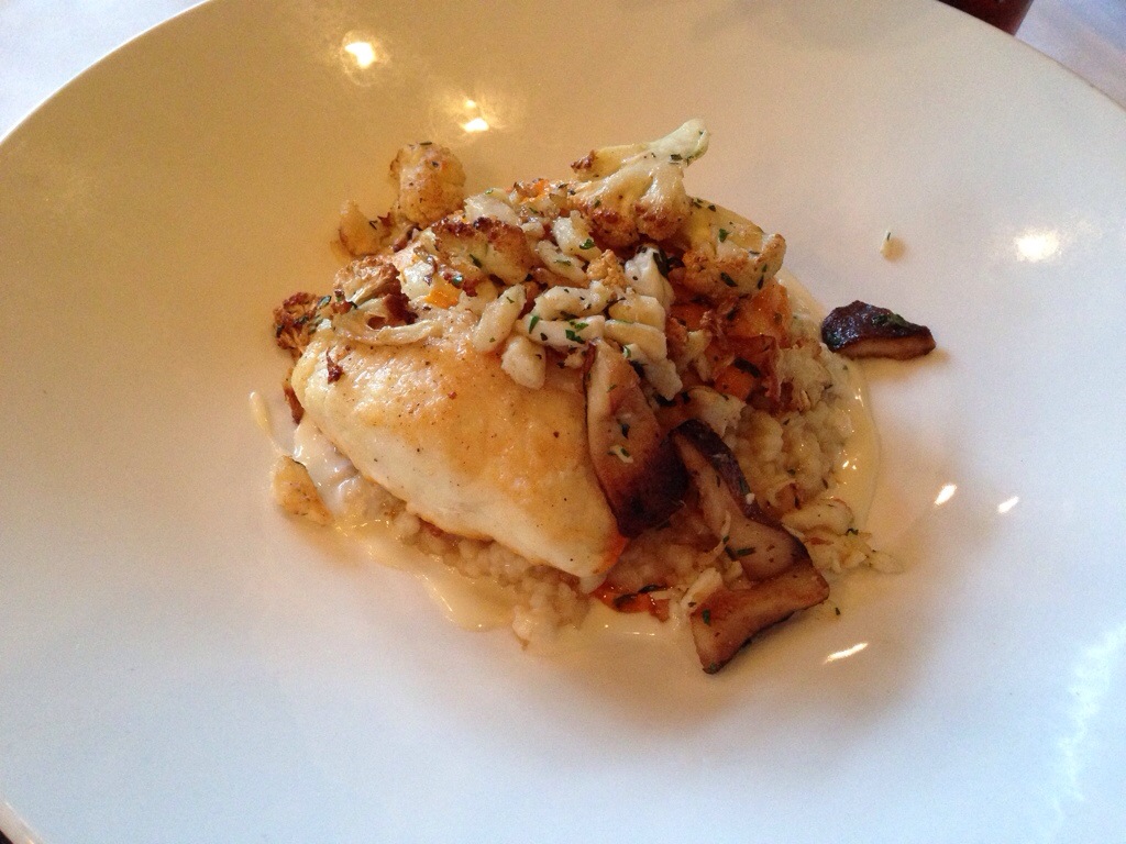 For dinner, she ordered one of the specials, a grilled halibut with shiitake mushrooms and roasted cauliflower over risotto.
