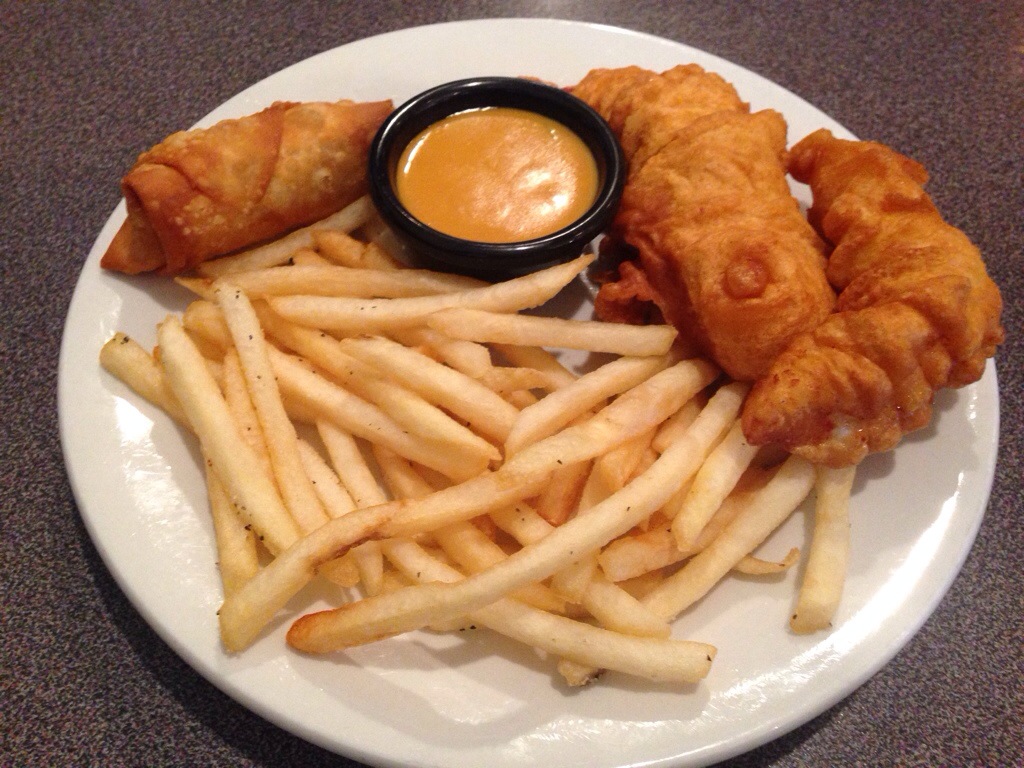 It’s a fairly large place (there’s a bar area on the right side of the entrance doors that’s about half as deep as the room I’m seated in) and there were three other parties, totaling ten folks, seated when I arrived. Several sources on line refer to Tanner’s as a sports bar, and that probably is the best description of the feel. Looking at the menu, I was studying the menu when the waitress returned and I asked about lunch specials -there wasn’t a “lunch menu, per se). She told me about Tanner’s Best – two chicken fingers, chicken ” lips” and fries. I took the bait.